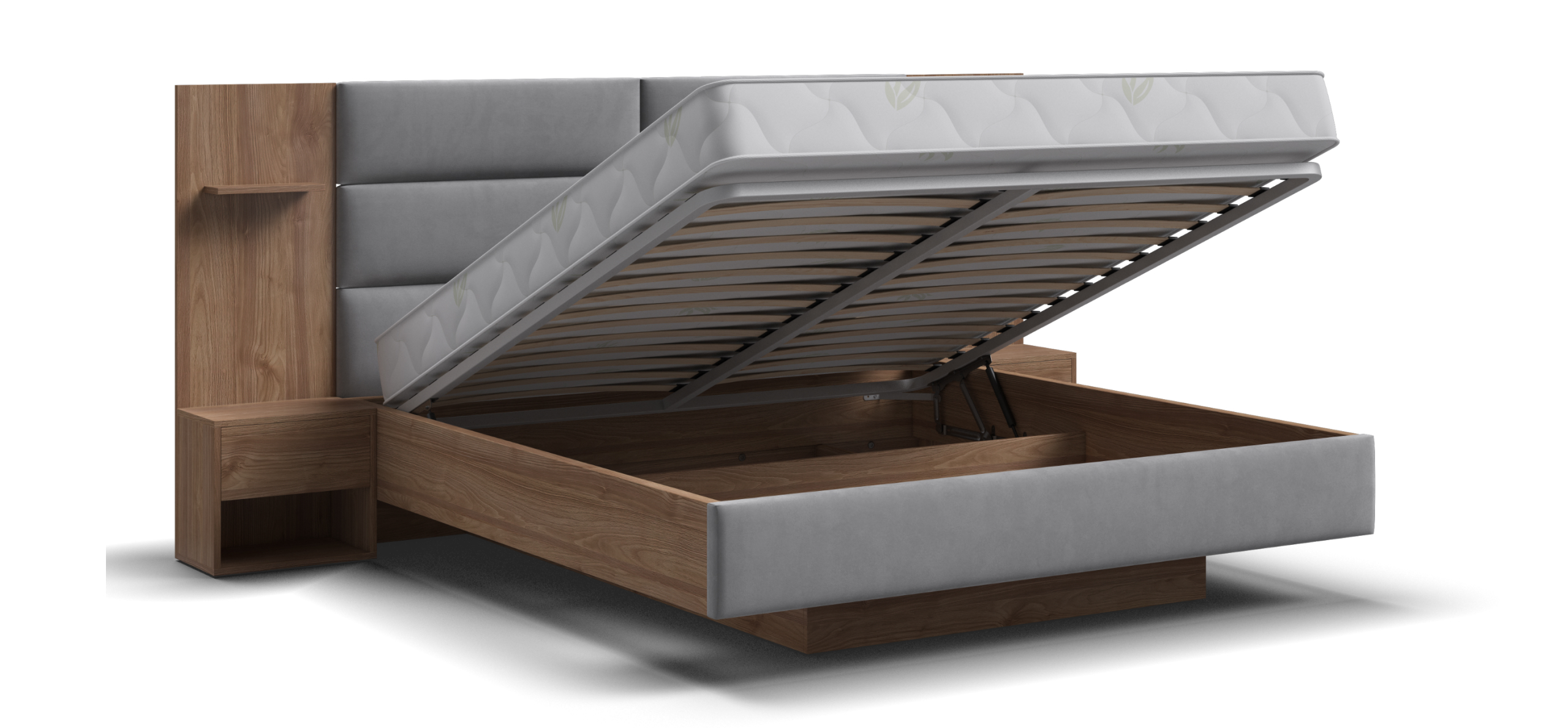Кровать BOSS LOFT оснащена усиленным ортопедическим основанием с подъёмным механизмом, что обеспечивает удобный доступ к бельевому коробу объемом 425 литров. Это делает хранение постельного белья и других вещей более удобным и организованным. Газовые лифты, изготовленные из авиационного алюминия, обеспечивают легкость и надежность подъема.
