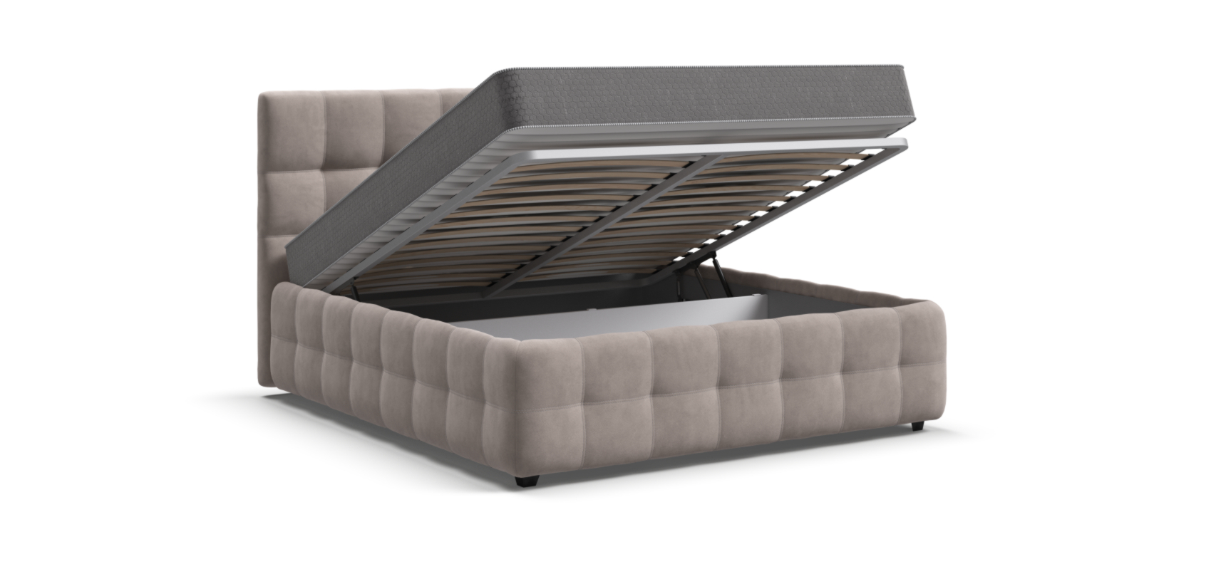 Особое внимание заслуживают газовые лифты SpaceLift, изготовленные из авиационного алюминия. Они обеспечивают лёгкое и плавное поднятие матраса, что делает доступ к отсеку для хранения быстрым и удобным. Дизайн 360 предполагает, что задняя часть спинки кровати также выполнена из основной ткани, что позволяет размещать кровать не только у стены, но и в центре комнаты, сохраняя при этом её эстетическую привлекательность.