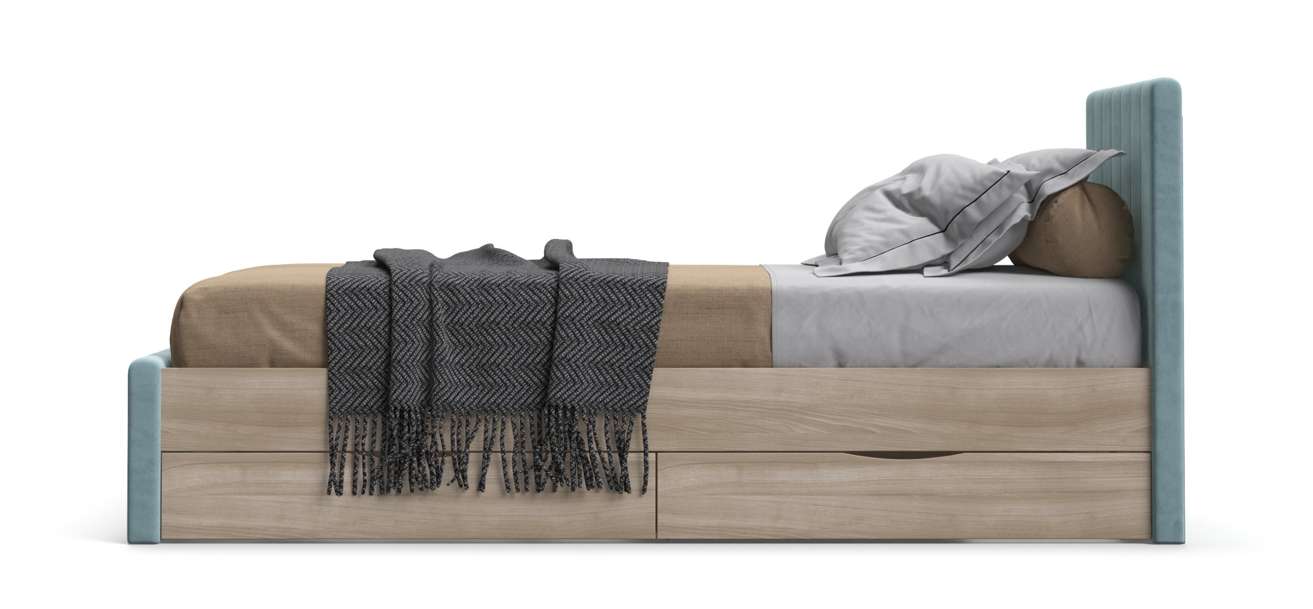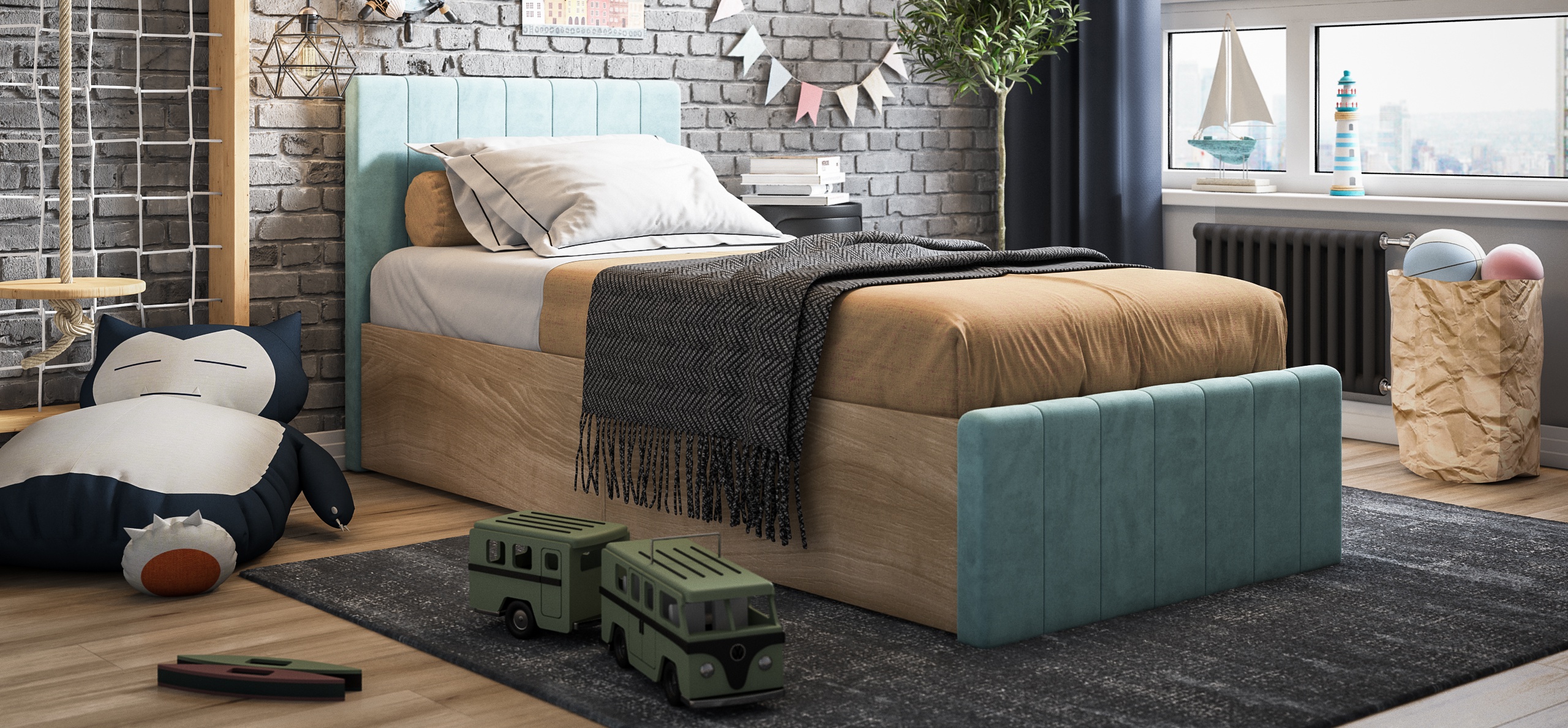 Фурнитура, разработанная по европейским стандартам качества, и экологичные материалы, устойчивые к царапинам, подчёркивают высокий уровень качества кровати. Конструкция рассчитана на большие нагрузки, что делает её идеальным выбором для детей и подростков. Современное сочетание ткани и материалов под натуральное дерево придаёт кровати стильный и модный вид, что сделает её украшением любой комнаты.