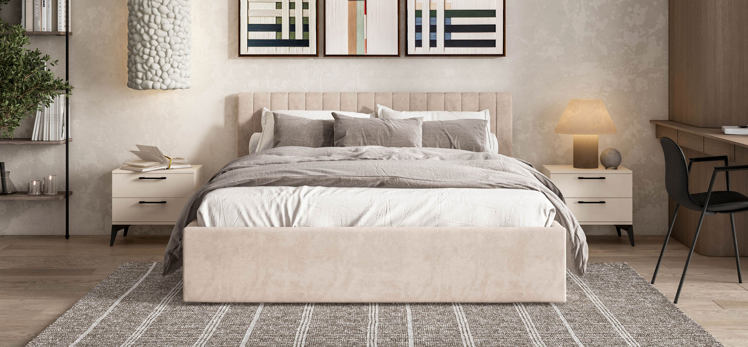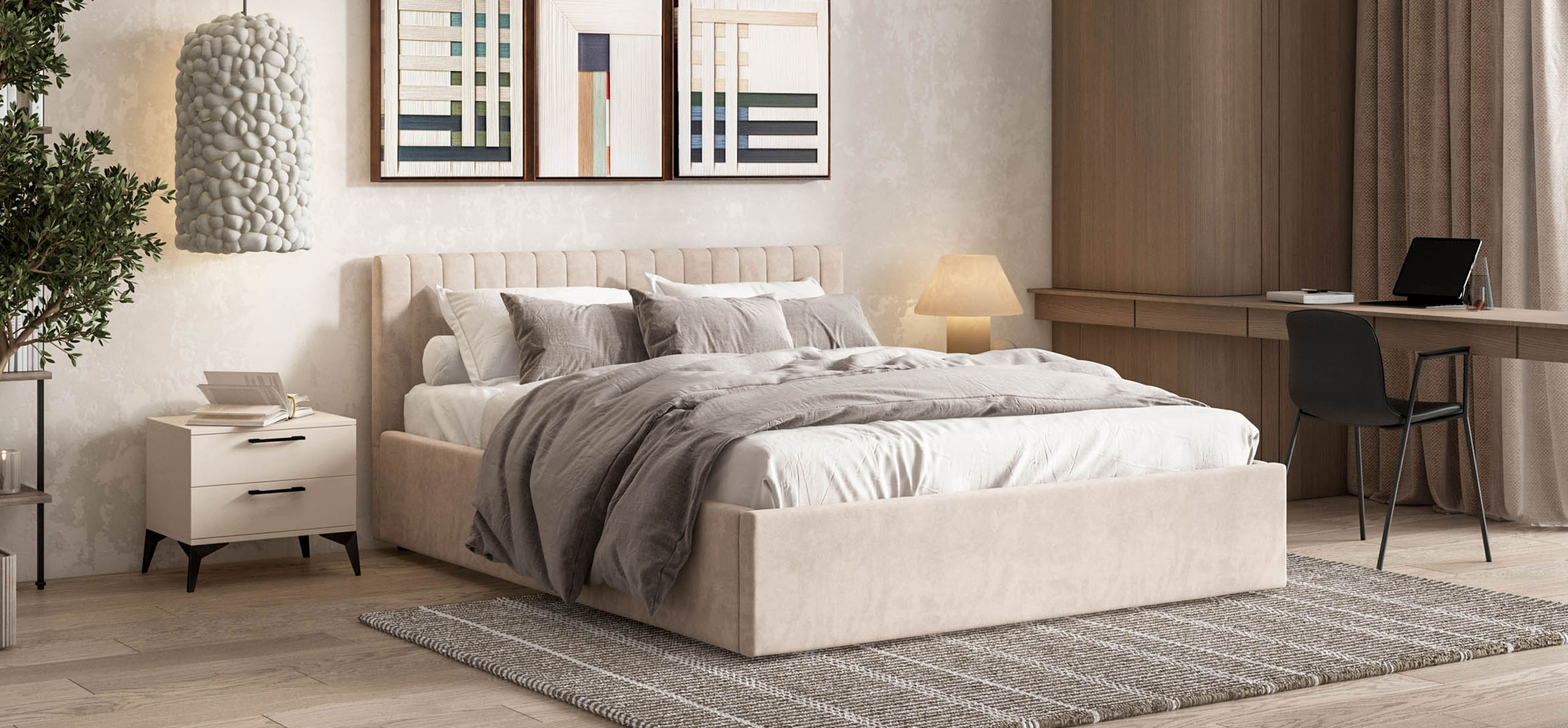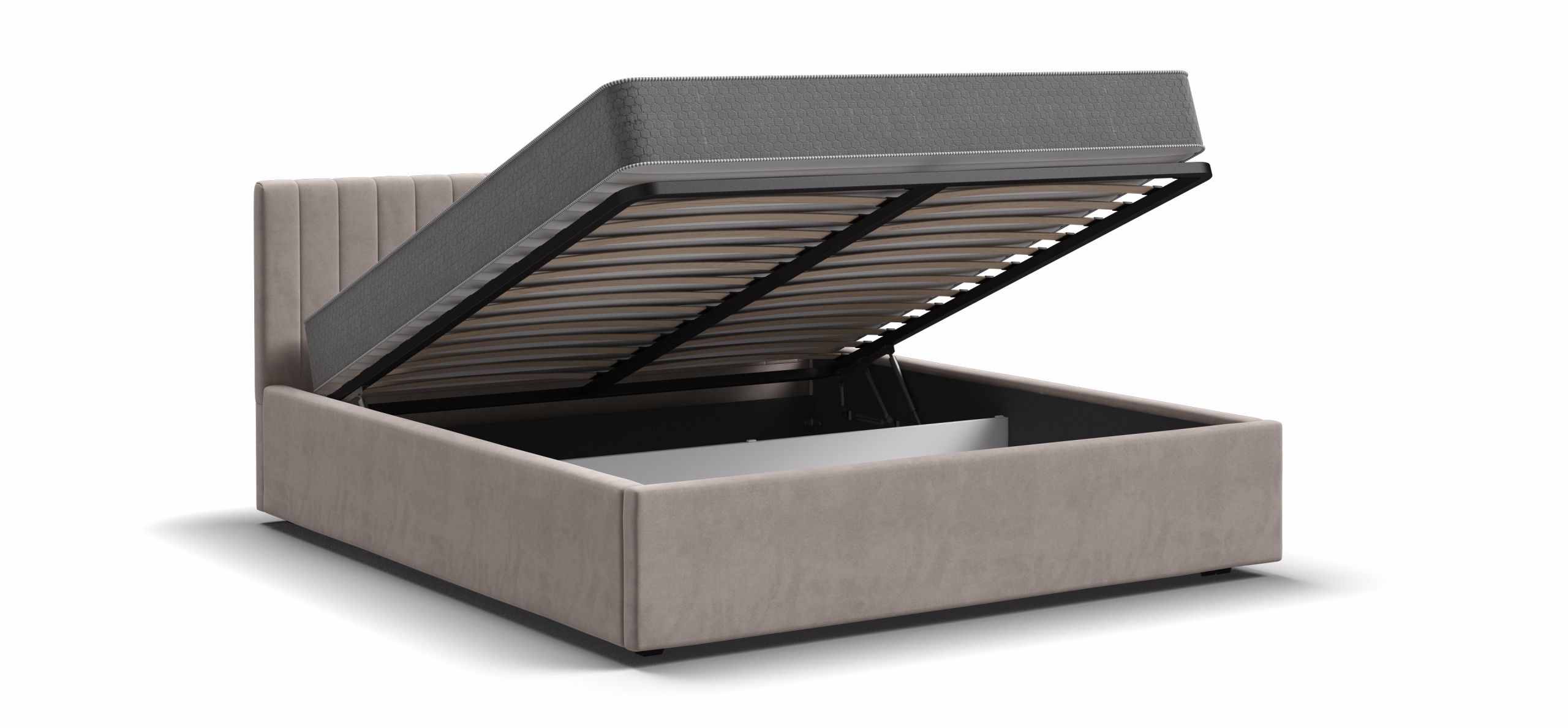 В кровати используются газлифты из авиационного алюминия SpaceLift, что обеспечивает легкость и надежность подъема. Скрытое отделение для хранения белья объемом 450 литров, HideBox, добавляет практичности и помогает поддерживать порядок в спальне.