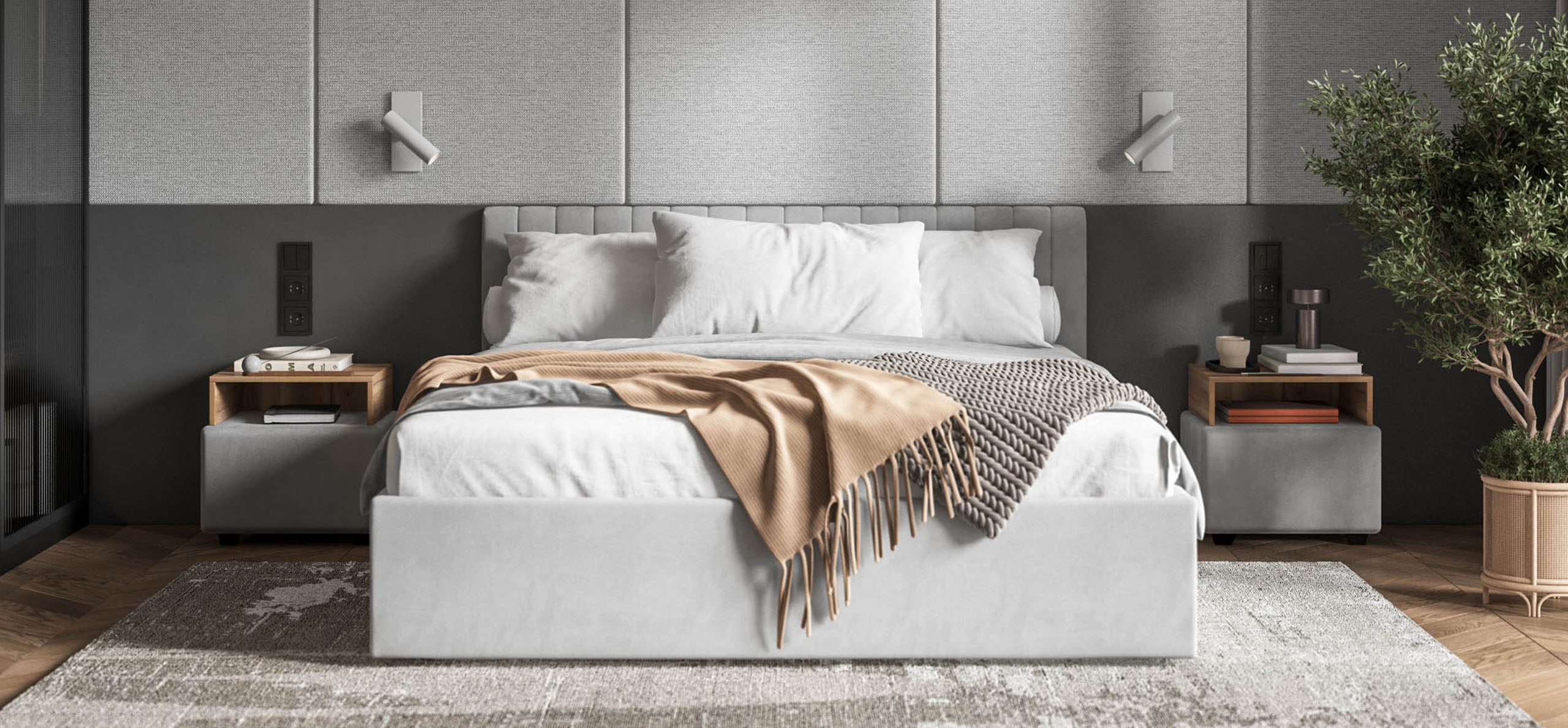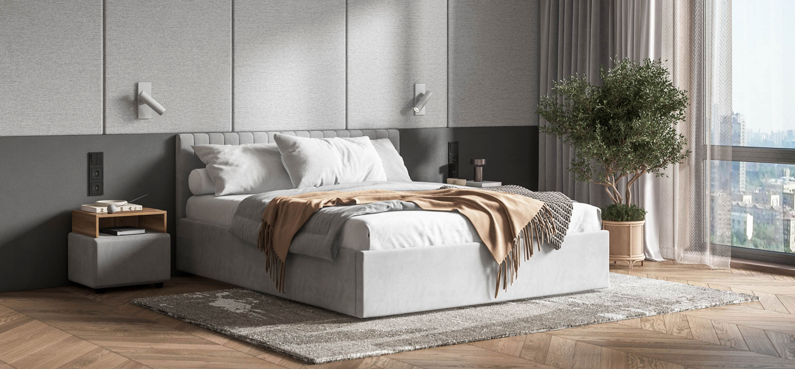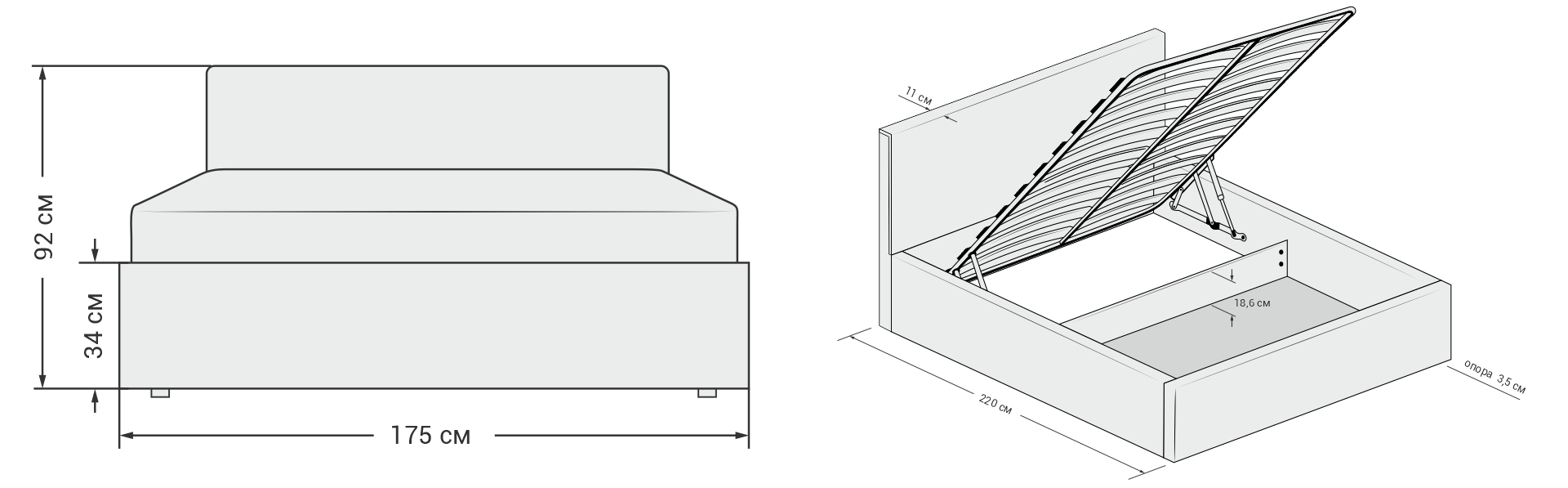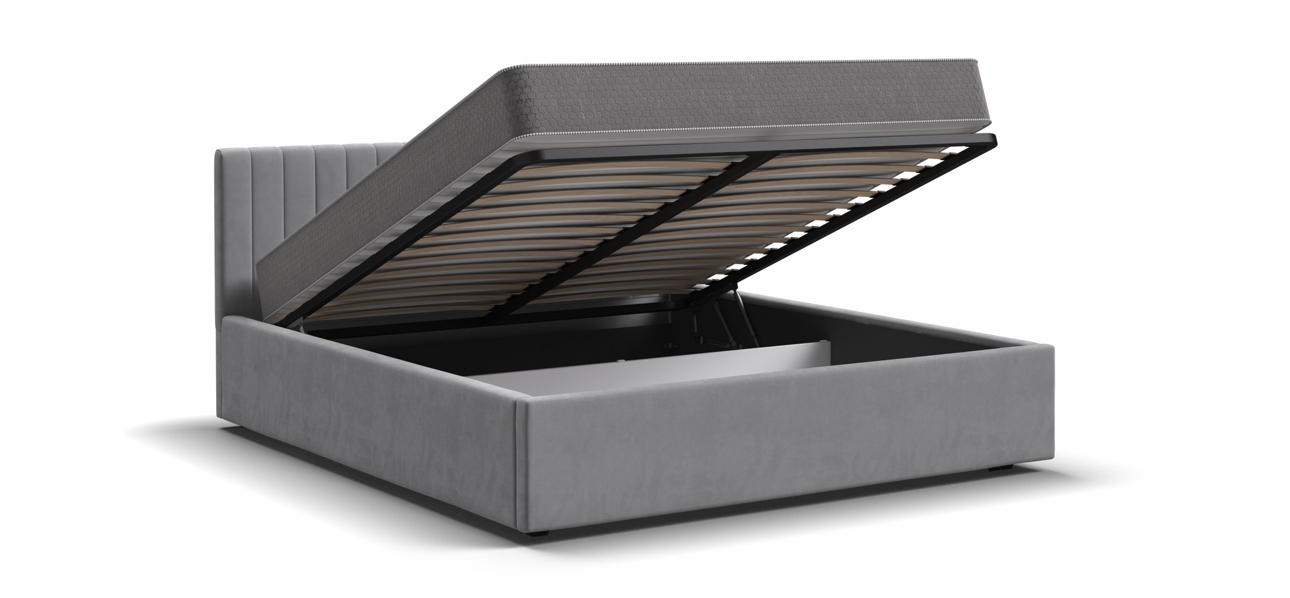 В кровати используются газлифты из авиационного алюминия SpaceLift, что обеспечивает легкость и надежность подъема. Скрытое отделение для хранения белья объемом 450 литров, HideBox, добавляет практичности и помогает поддерживать порядок в спальне.