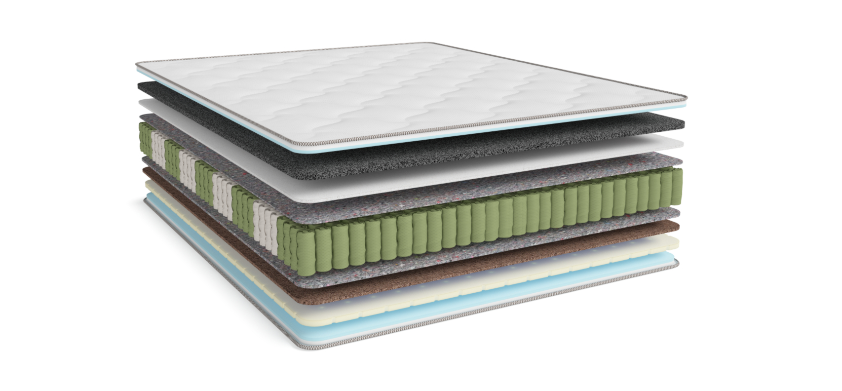 Угольная пена CARBONE FOAM, слой BOSS SKIN, термовойлок, НПБ BOSS SPRING 1000, латексированная кокосовая койра, латекс