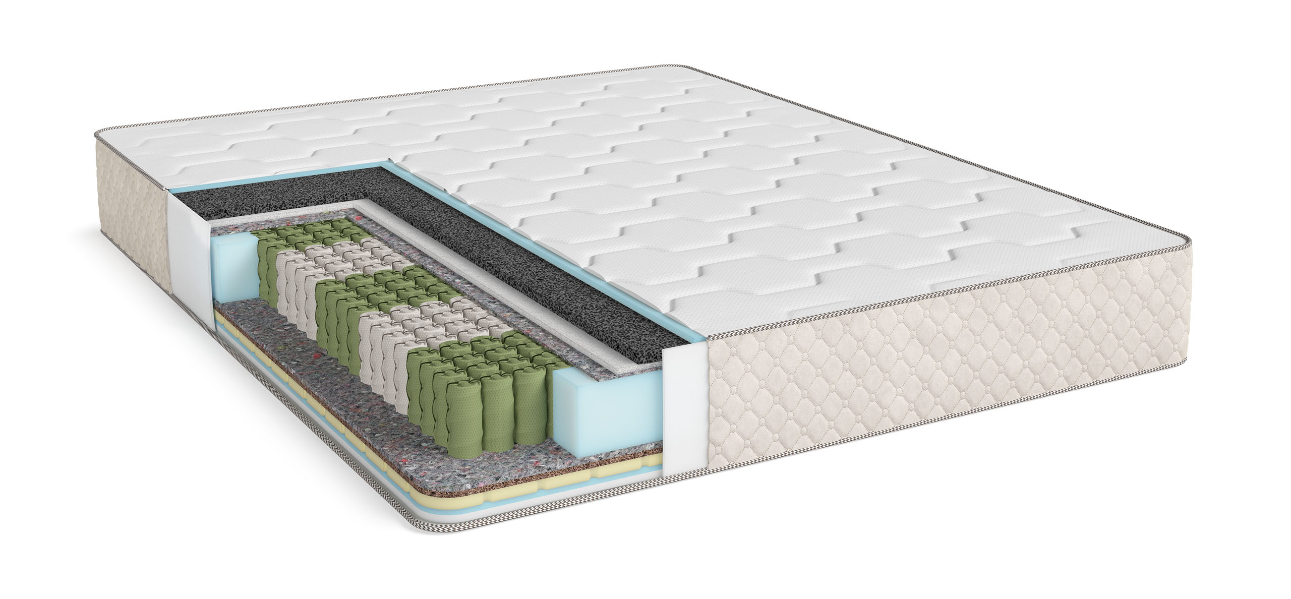 Матрас имеет в своём наполнение слой натурального латекса, изготовленного из сока каучукового дерева Гевея, что позволяет телу принимать удобную позицию. Материал повторяет изгибы тела и создает обезболивающий эффект для суставов и мышц. Слой гипоаллергенной пены с угольной пропиткой препятствует развитию вредных микроорганизмов, не накапливает пыль и снимает мышечное напряжение.