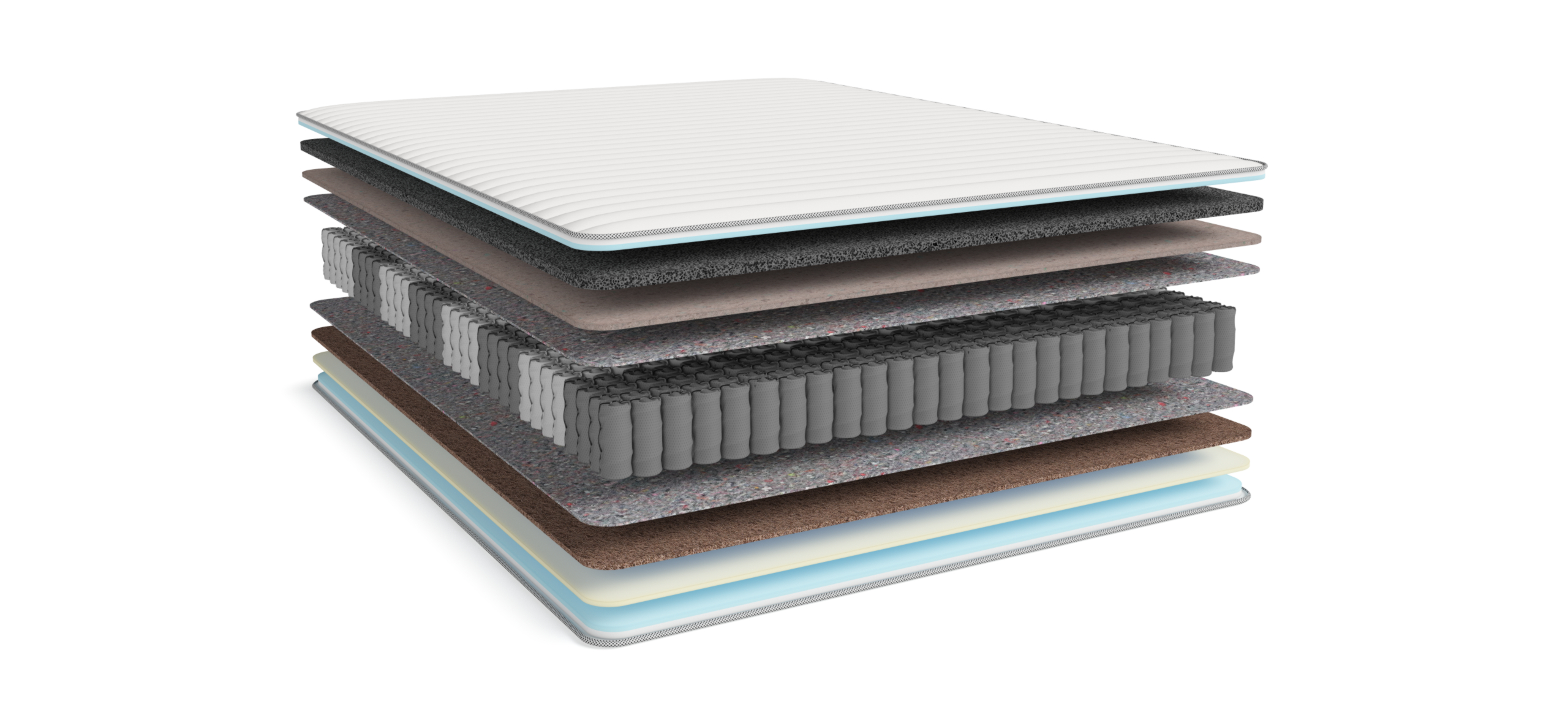 Угольная пена CARBONE FOAM, слой BOSS SKIN, термовойлок, НПБ COMFY SPRING 850, латексированная кокосовая койра, искусственный латекс