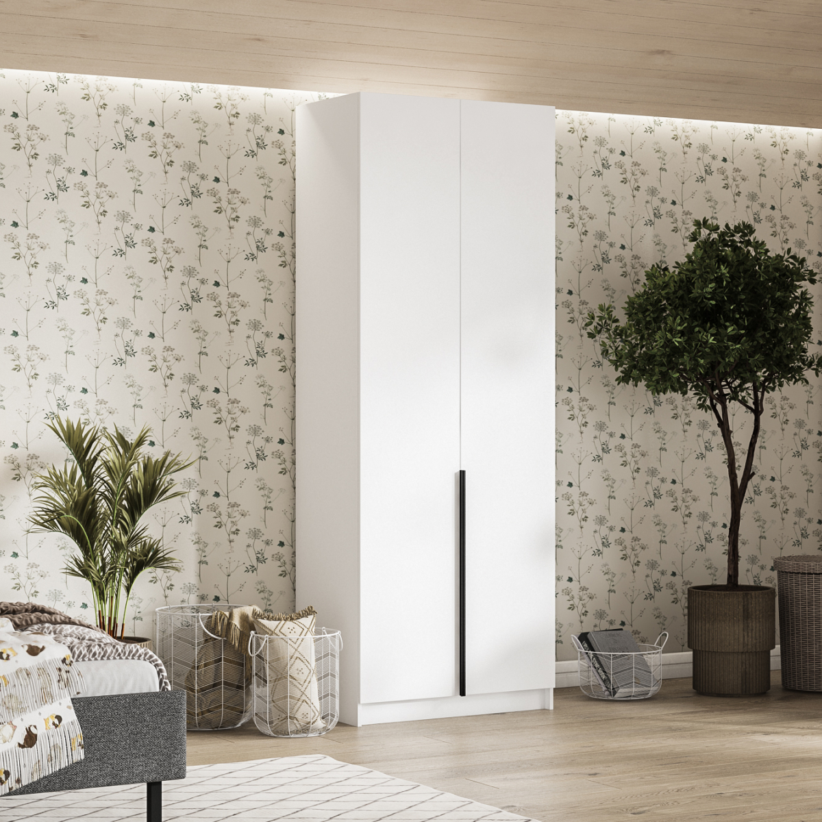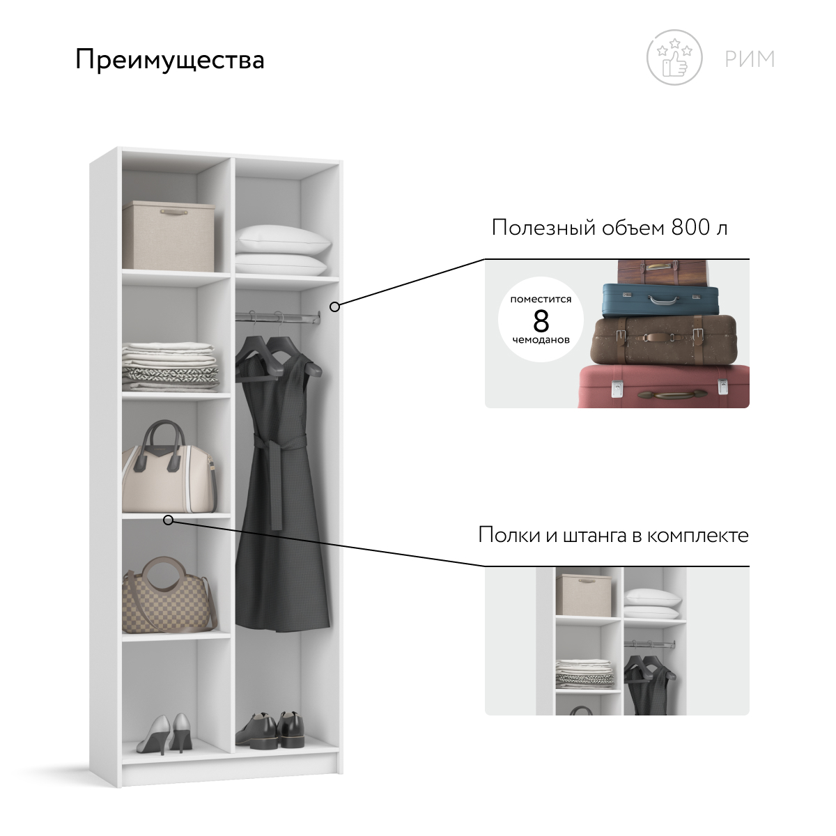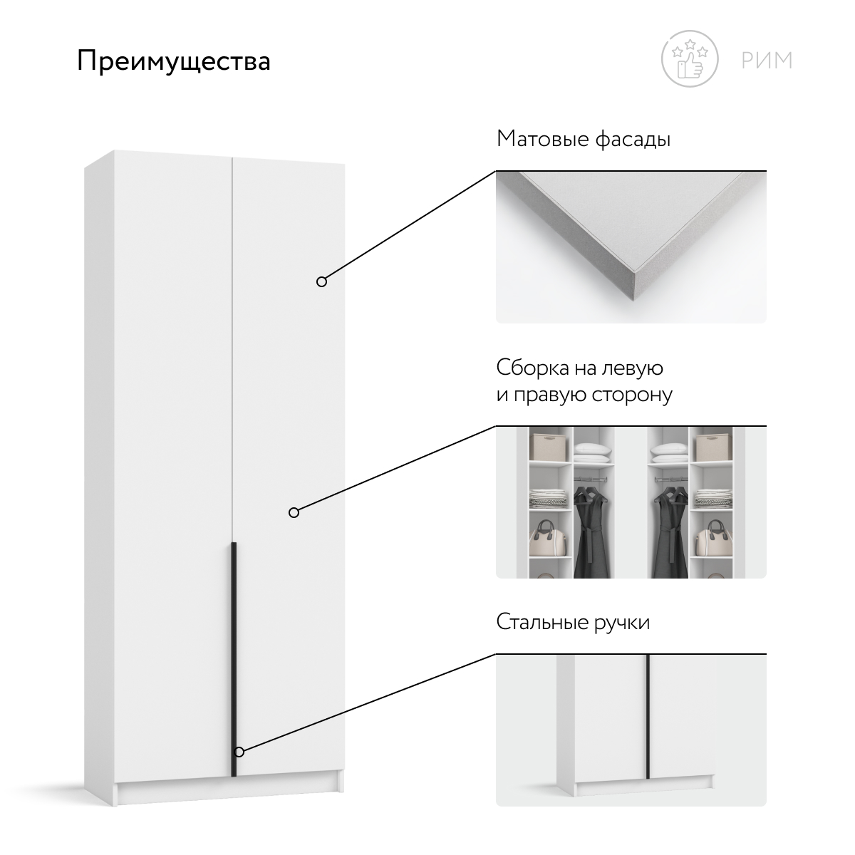 Шкаф Рим 80 — компактный ответ на главный запрос городской квартиры: хранить нужное, сохраняя максимум свободного пространства. Лаконичный фасад с удлинёнными чёрными ручками отсылает к актуальной эстетике 2025 года и делает шкаф ярким акцентом любого интерьера — от сканди до неоклассики. Внутри продуман каждый сантиметр: аккуратное отделение легко принимает базовый гардероб, коробки с обувью и текстиль, поддерживая порядок и избавляя комнату от лишних вещей.