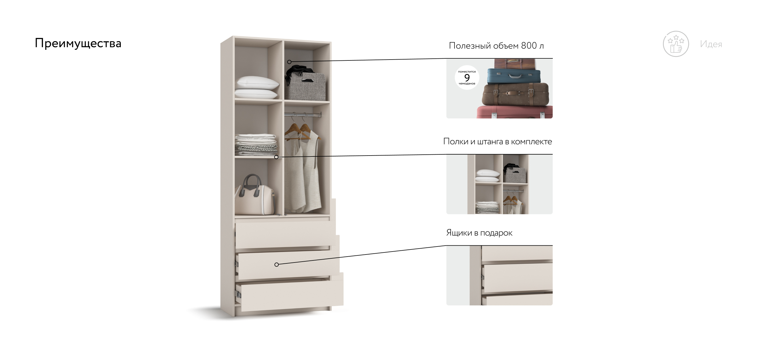 Когда руки заняты — лёгкое касание, и дверь мягко поддаётся. Внутри — ясная логика хранения: блок выдвижных ящиков работает как «мини-комод», помогает быстро разложить бельё и мелочи, а основной объём уверенно берёт на себя содержимое 9 крупных чемоданов — гардероб, обувные коробки, постельное.