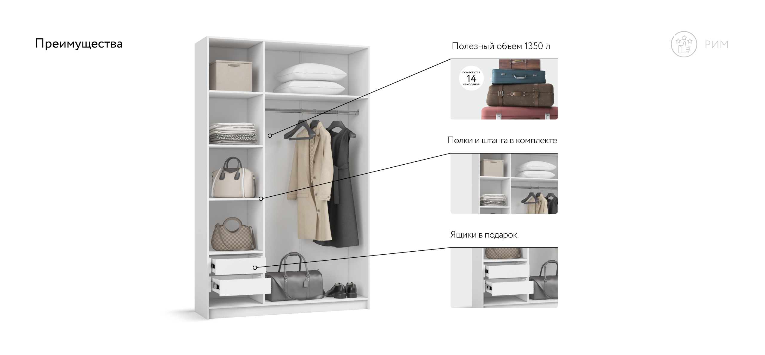 Корпус выполнен из безопасной ЛДСП класса Е1 с устойчивым к истиранию покрытием, чтобы цвет и текстура радовали долгие годы. Рим 135 создаёт ощущение простора и упорядоченности, превращая спальню или гостевую комнату в гармоничное, дышащее пространство. Выберите шкаф, который не просто хранит вещи, а наводит стильный порядок в вашей жизни.
