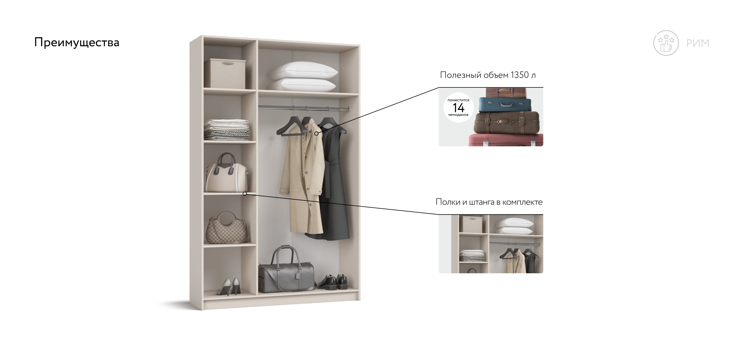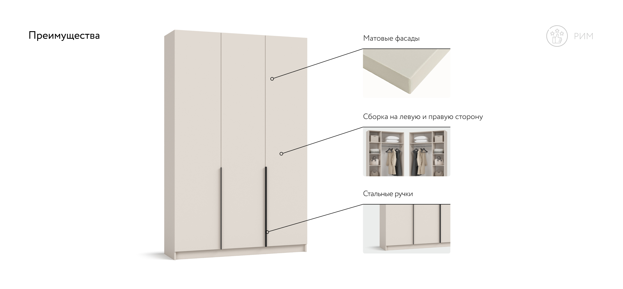 Шкаф Рим 135 — современный ответ на главный запрос городской квартиры: хранить много, занимая мало. Лаконичный фасад с удлинёнными чёрными ручками отсылает к эстетике 2025 года и становится выразительным акцентом любого интерьера — от сканди до неоклассики. Внутри продуман каждый сантиметр: просторное отделение легко принимает сезонный гардероб, коробки с обувью и постельное бельё, сохраняя порядок и освобождая комнату от лишних вещей. Полки и штанга могут располагаться как справа, так и слева, создавая удобную компоновку без лишних перестановок. Двери открываются мягко и бесшумно, превращая утренний сбор в приятно-тихий ритуал. Корпус из ЛДСП Е1 устойчив к износу и безопасен для домашнего воздуха, а аккуратно отделанная задняя стенка позволяет разместить шкаф не только у стены, но и в свободной планировке. Рим 135 создаёт ощущение простора и упорядоченности, превращая спальню или гостевую комнату в гармоничное, дышащее пространство.