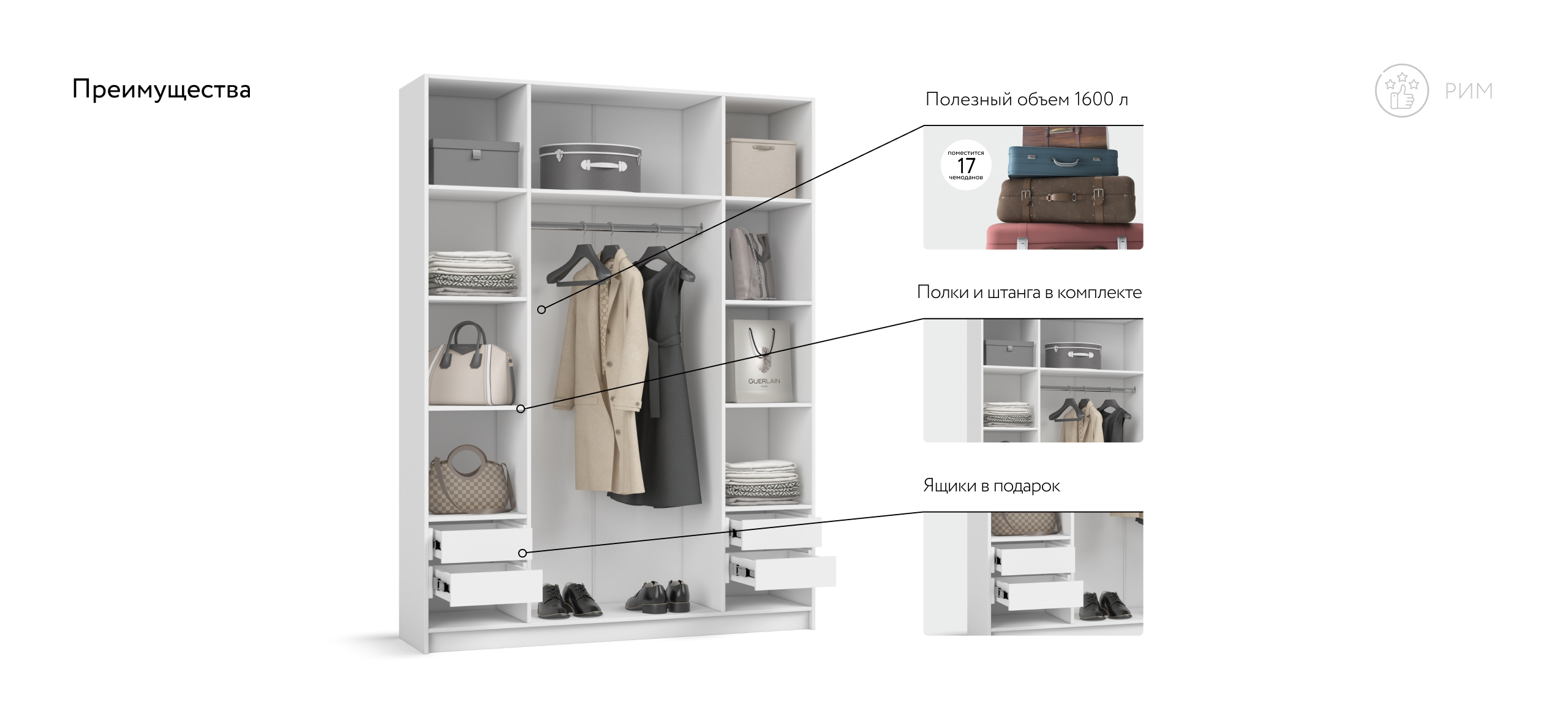 По бокам — две симметричные секции: полки сверху, а под ними — по два выдвижных ящика; в центре — штанга для длинной одежды. Такая компоновка экономит время на поиск вещей и избавляет от необходимости выбирать, какая сторона «главная». Четыре ящика на шариковых направляющих выдвигаются легко и бесшумно, а створки открываются плавным движением, не нарушая утренний ритм.