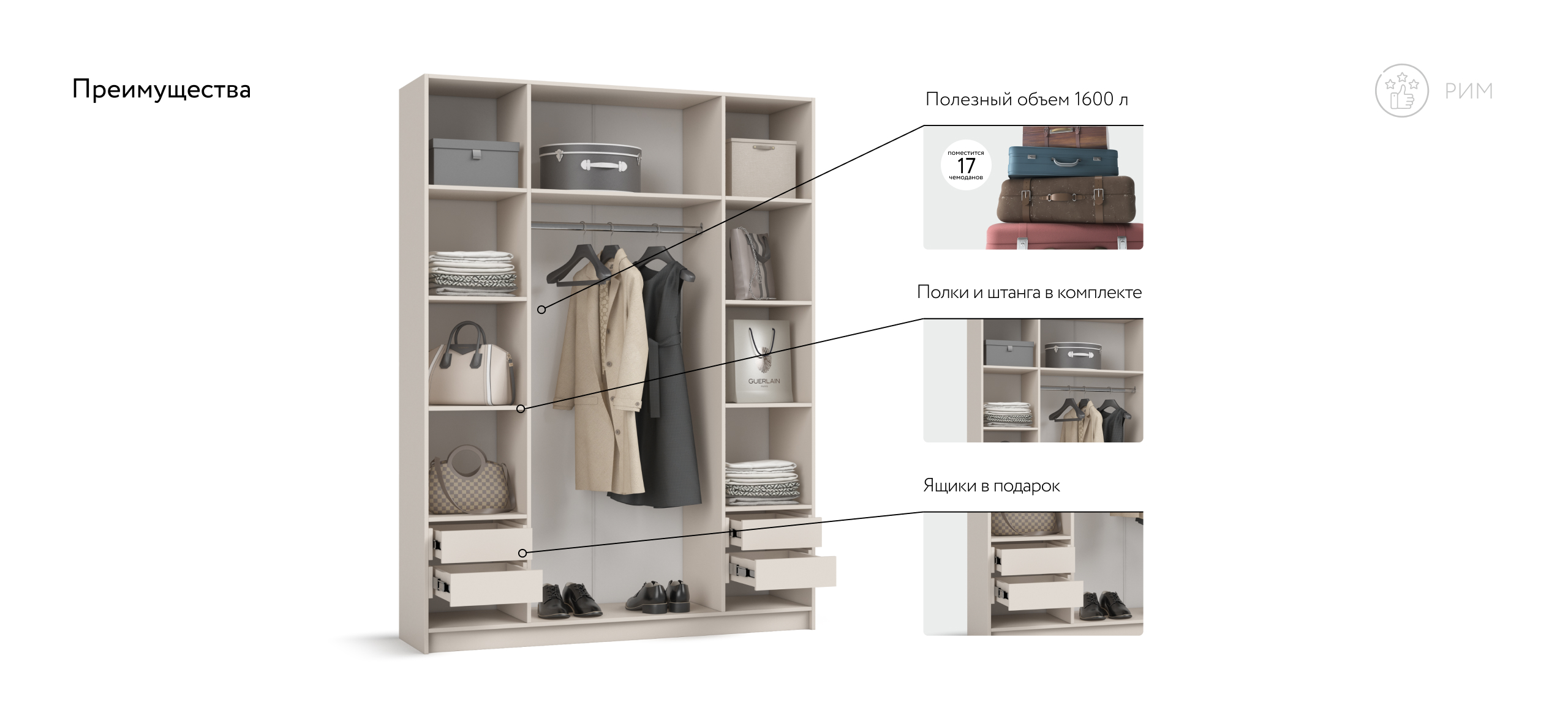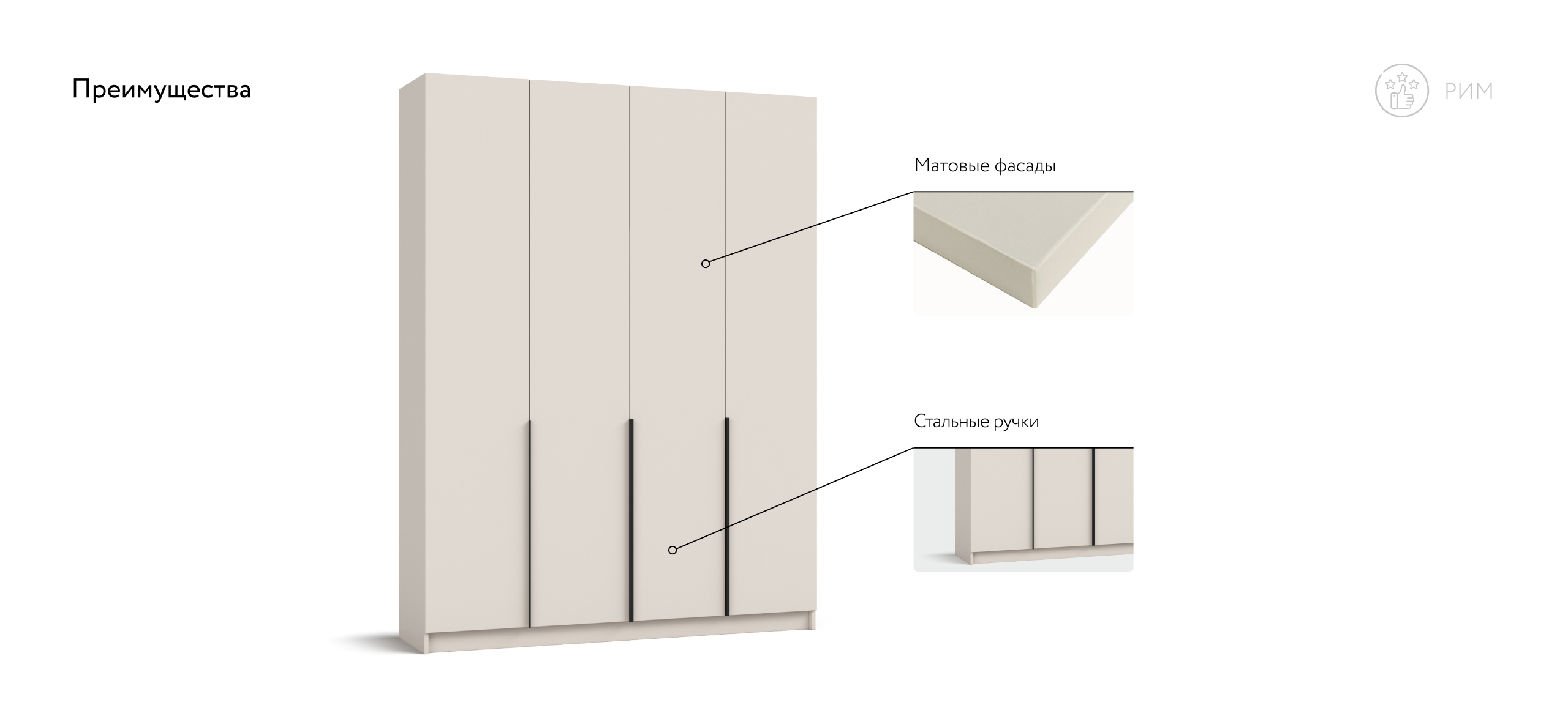 Шкаф Рим 160 — масштабное решение для тех, кто хочет хранить много и держать интерьер в современных трендах. Лаконичный фасад с удлинёнными чёрными ручками отражает эстетику 2025 года и становится выразительным акцентом любой спальни — от сканди до неоклассики. Увеличенная ширина и симметричная конструкция позволяют разместить сезонный гардероб, обувные коробки и текстиль так, чтобы в комнате осталось больше свободного пространства.