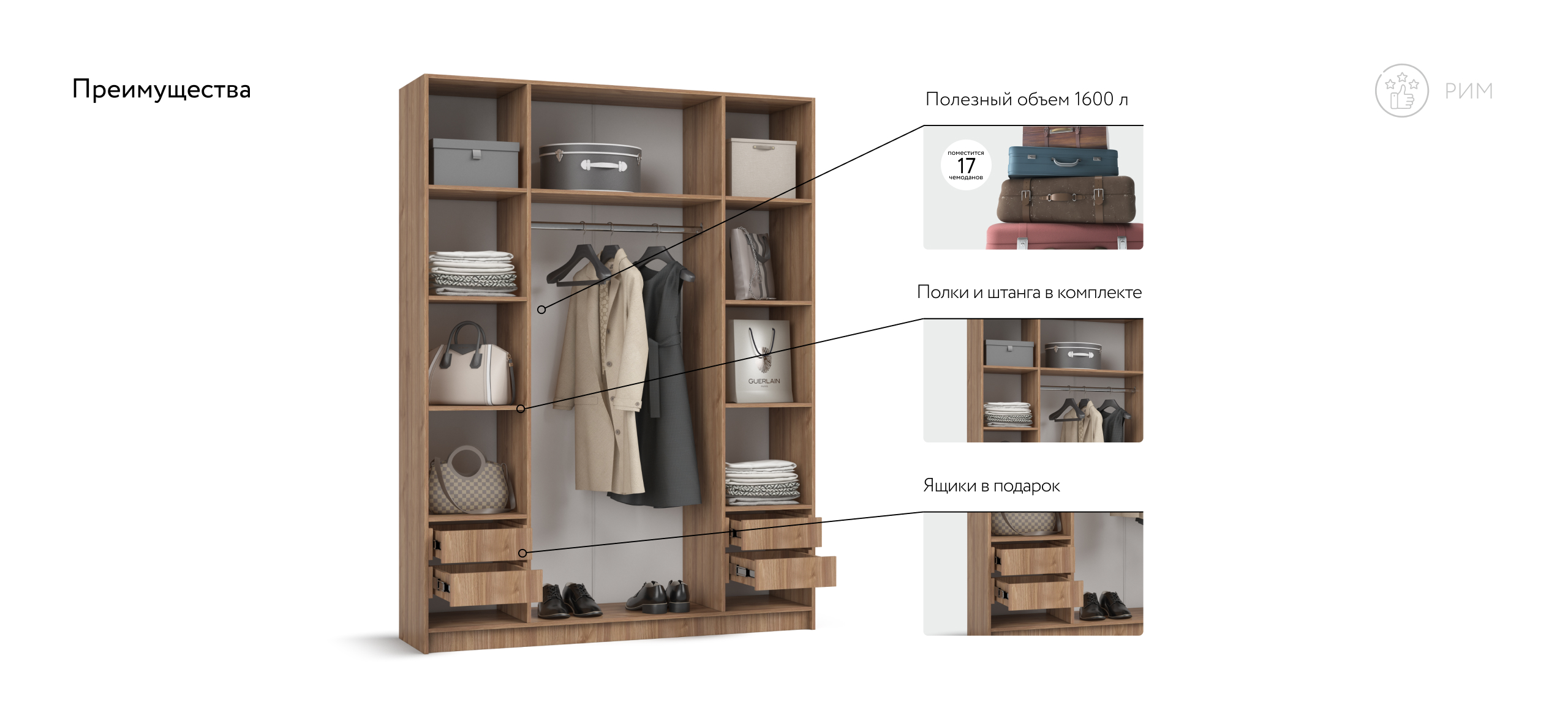 По бокам — две симметричные секции: полки сверху, а под ними — по два выдвижных ящика; в центре — штанга для длинной одежды. Такая компоновка экономит время на поиск вещей и избавляет от необходимости выбирать, какая сторона «главная». Четыре ящика на шариковых направляющих выдвигаются легко и бесшумно, а створки открываются плавным движением, не нарушая утренний ритм.