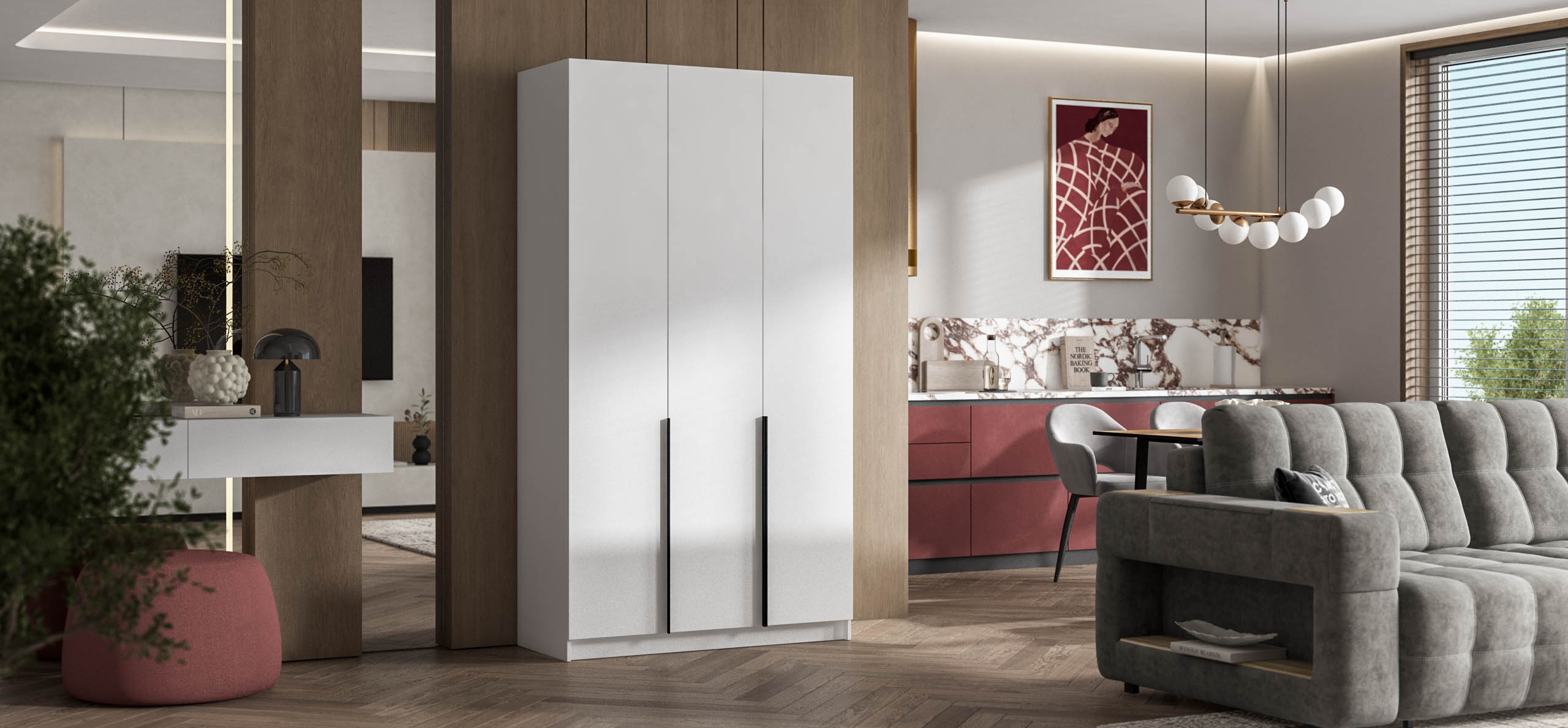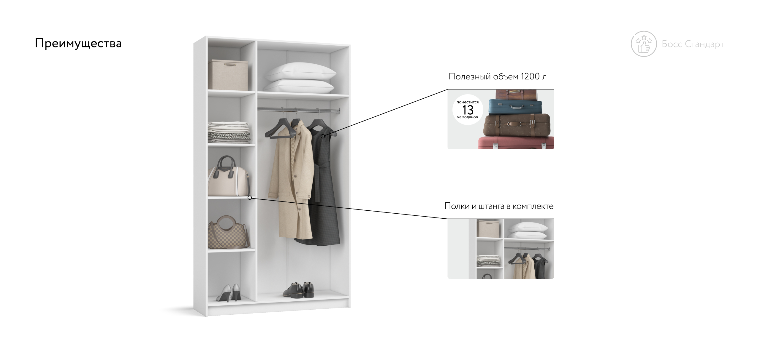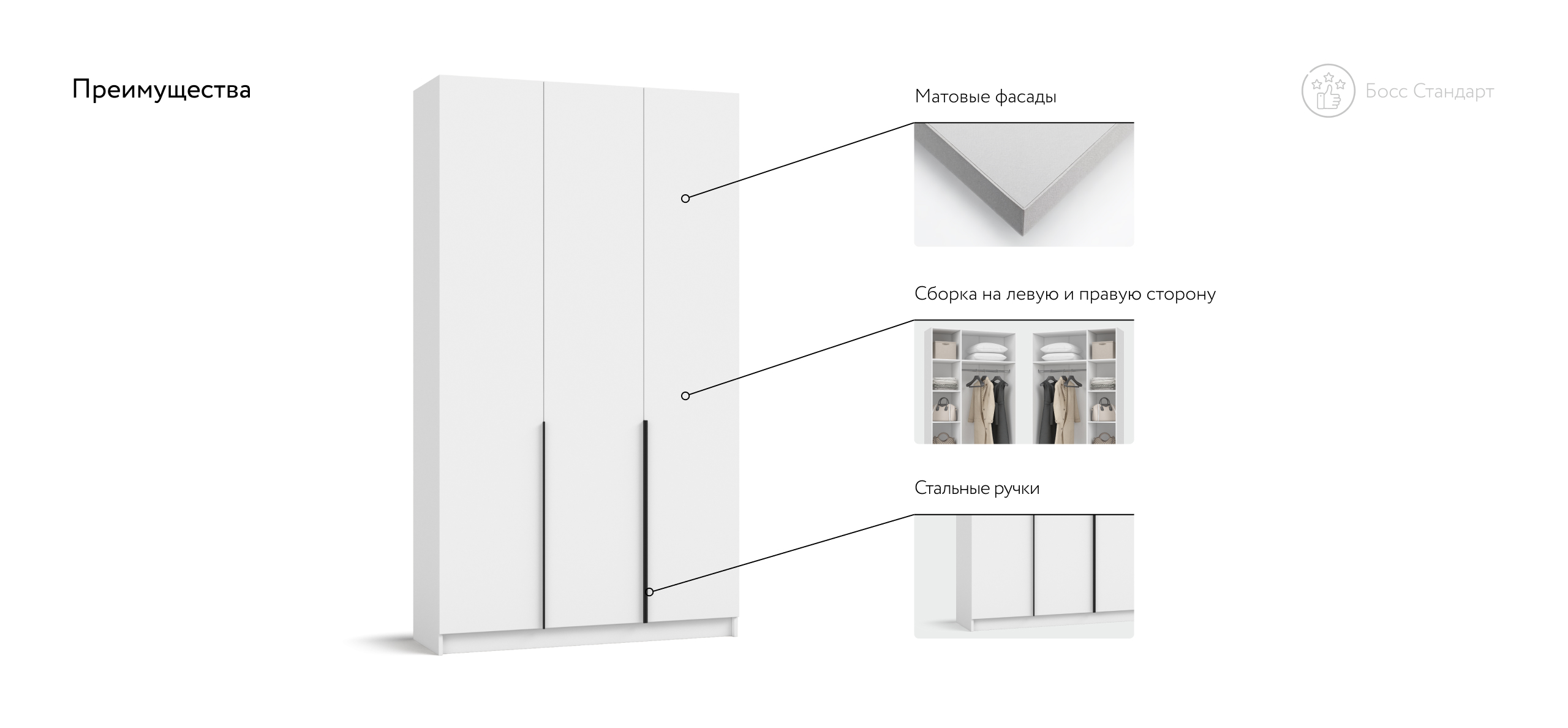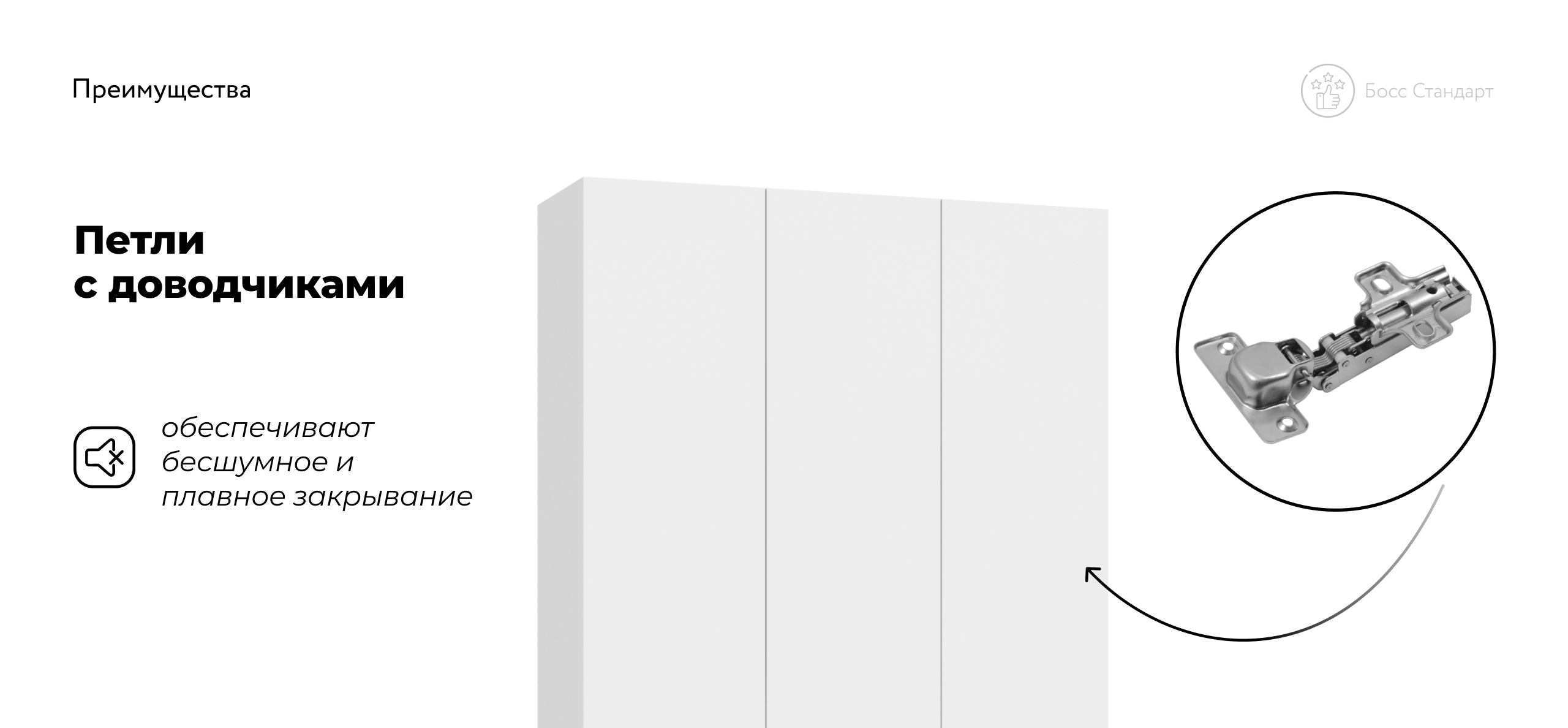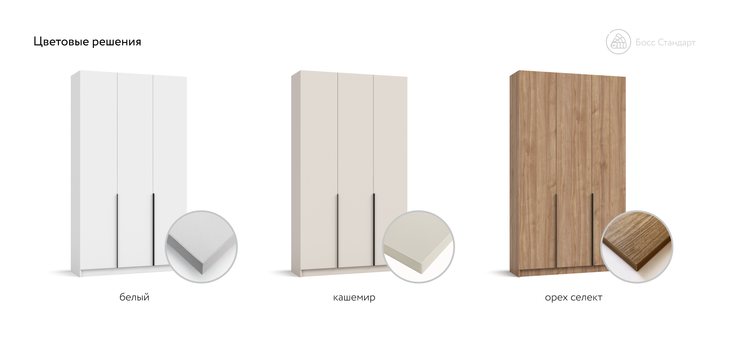 Двери с премиальными доводчиками открываются мягко и бесшумно, превращая утренний сбор в тихий ритуал. Корпус изготовлен из безопасной ЛДСП Е1 с износостойким покрытием, а аккуратно отделанная задняя стенка позволяет установить шкаф не только у стены, но и в свободной планировке. Босс Стандарт 120 создаёт ощущение простора и упорядоченности, превращая спальню или гостевую комнату в гармоничное, «дышащее» пространство.