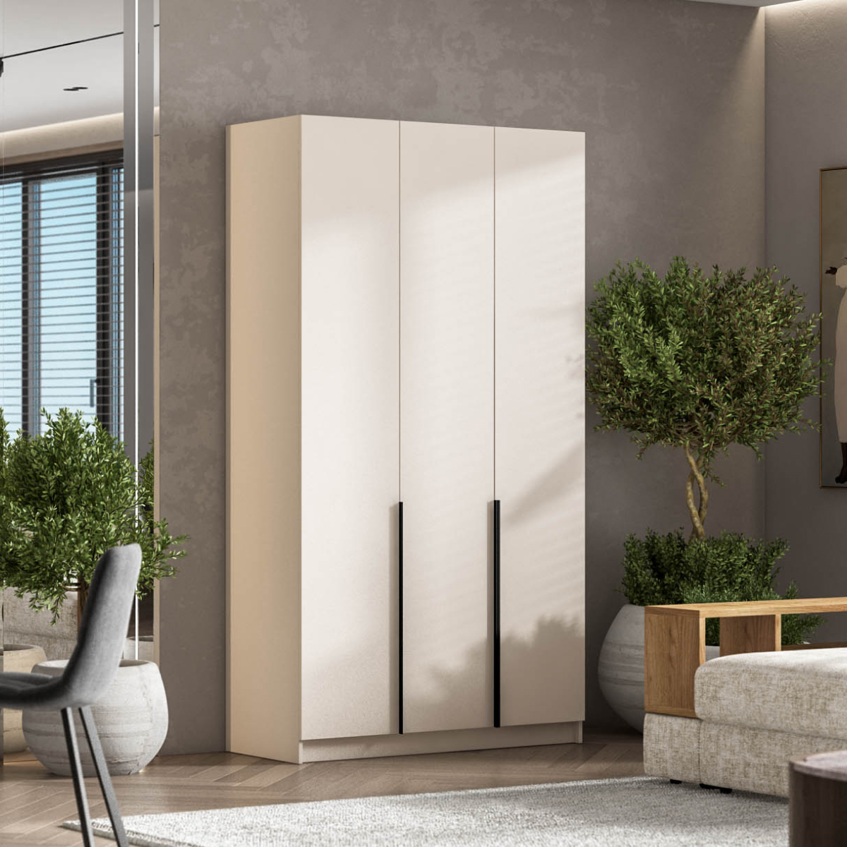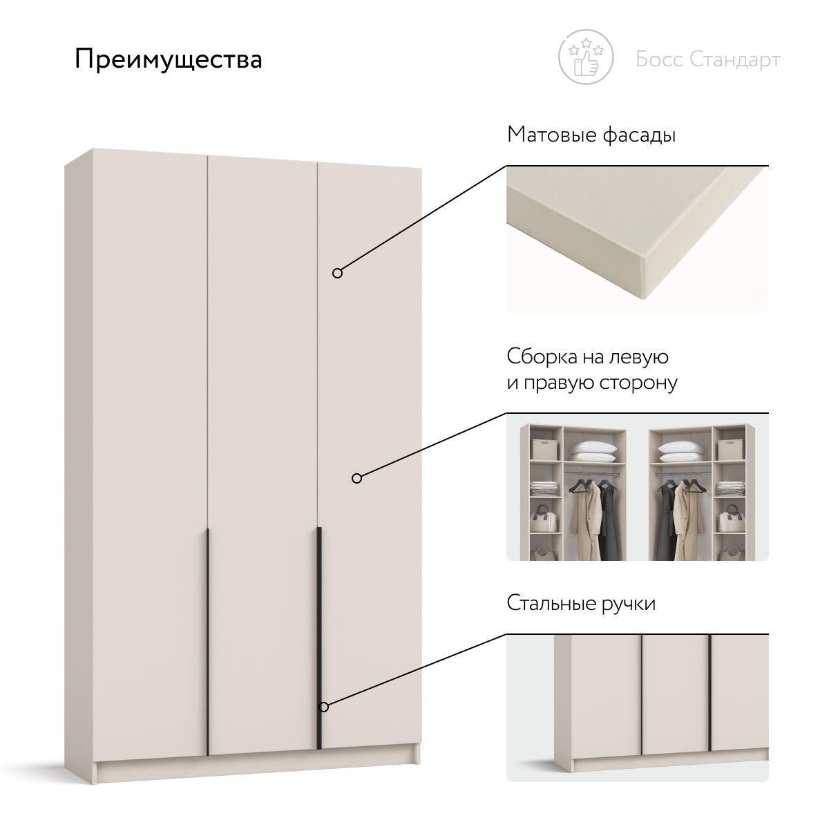 Двери с премиальными доводчиками открываются мягко и бесшумно, превращая утренний сбор в тихий ритуал. Корпус изготовлен из безопасной ЛДСП Е1 с износостойким покрытием, а аккуратно отделанная задняя стенка позволяет установить шкаф не только у стены, но и в свободной планировке. Босс Стандарт 120 создаёт ощущение простора и упорядоченности, превращая спальню или гостевую комнату в гармоничное, «дышащее» пространство.