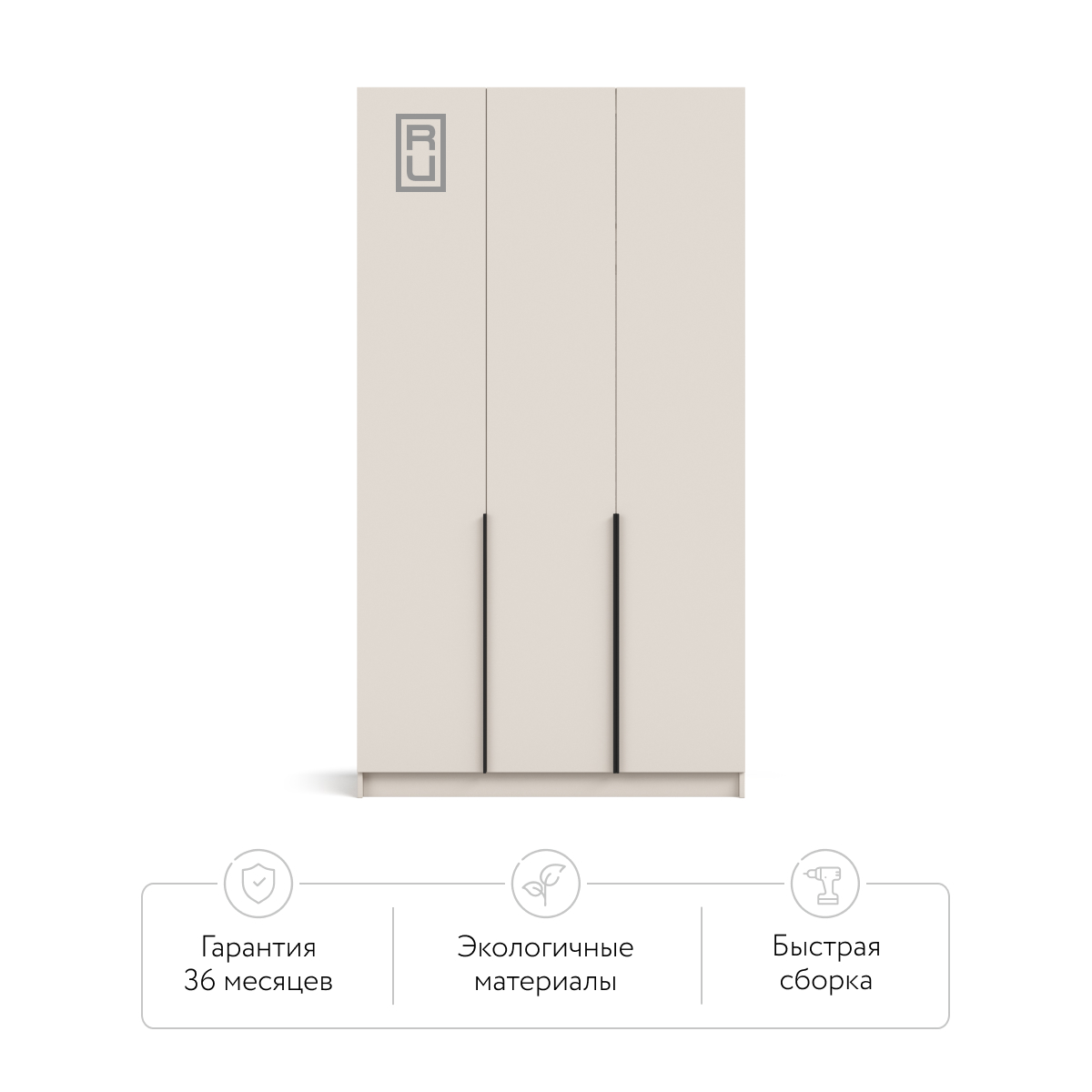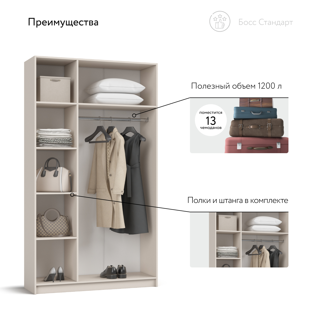 Внутри продуман каждый сантиметр: просторное отделение легко принимает сезонный гардероб, коробки с обувью и постельное бельё, сохраняя порядок и освобождая комнату от лишних вещей. Полки и штангу можно разместить как справа, так и слева, формируя удобную компоновку без лишних перестановок.