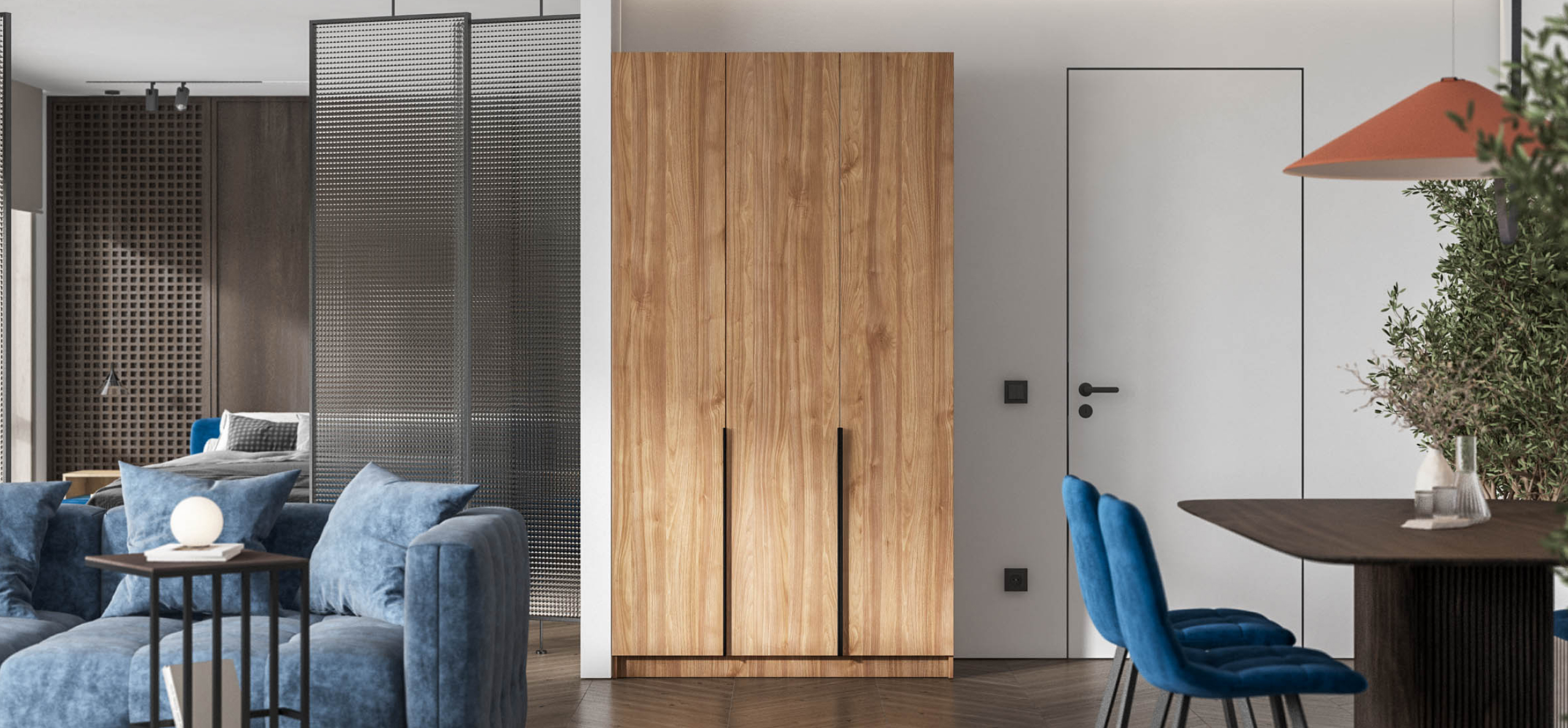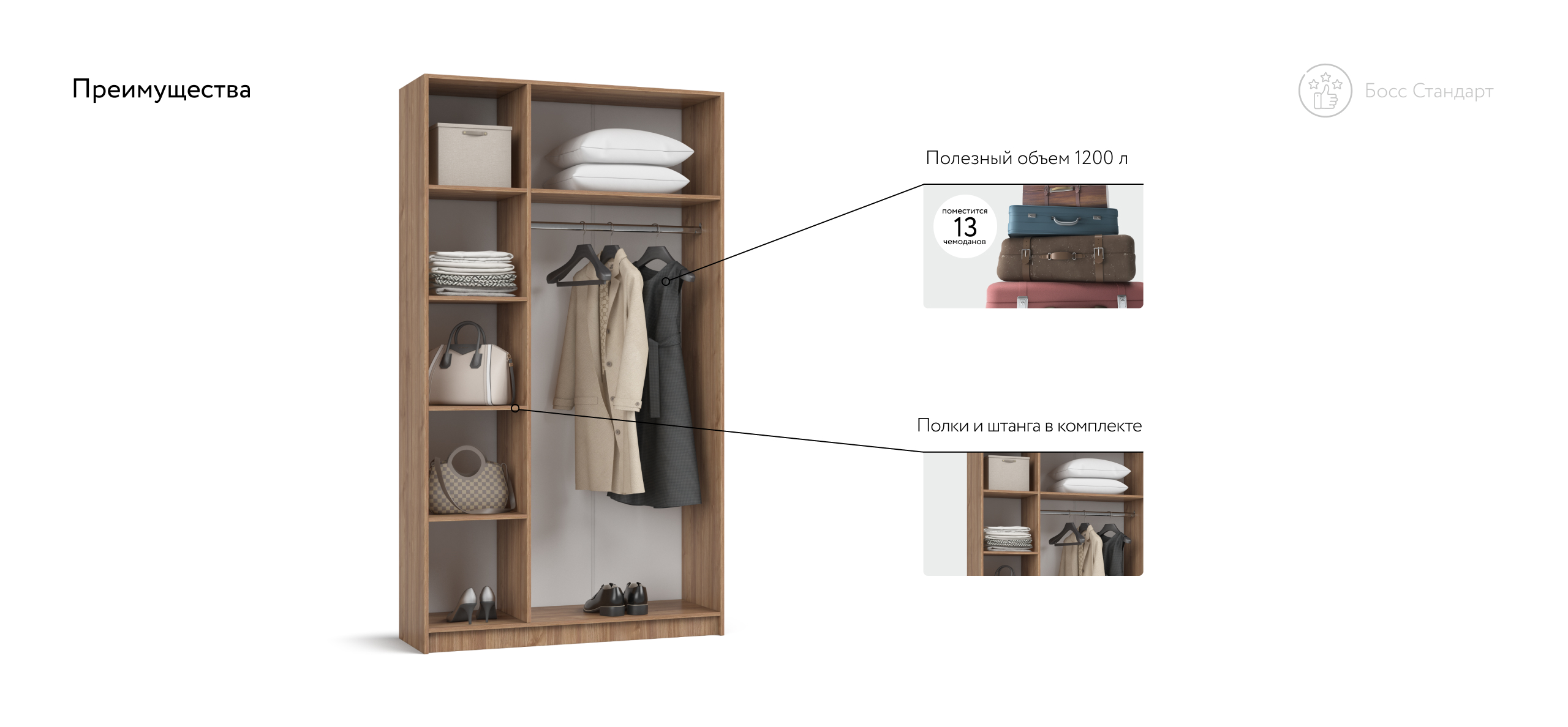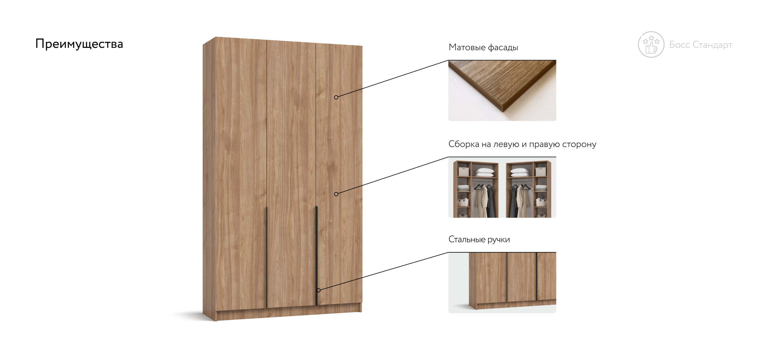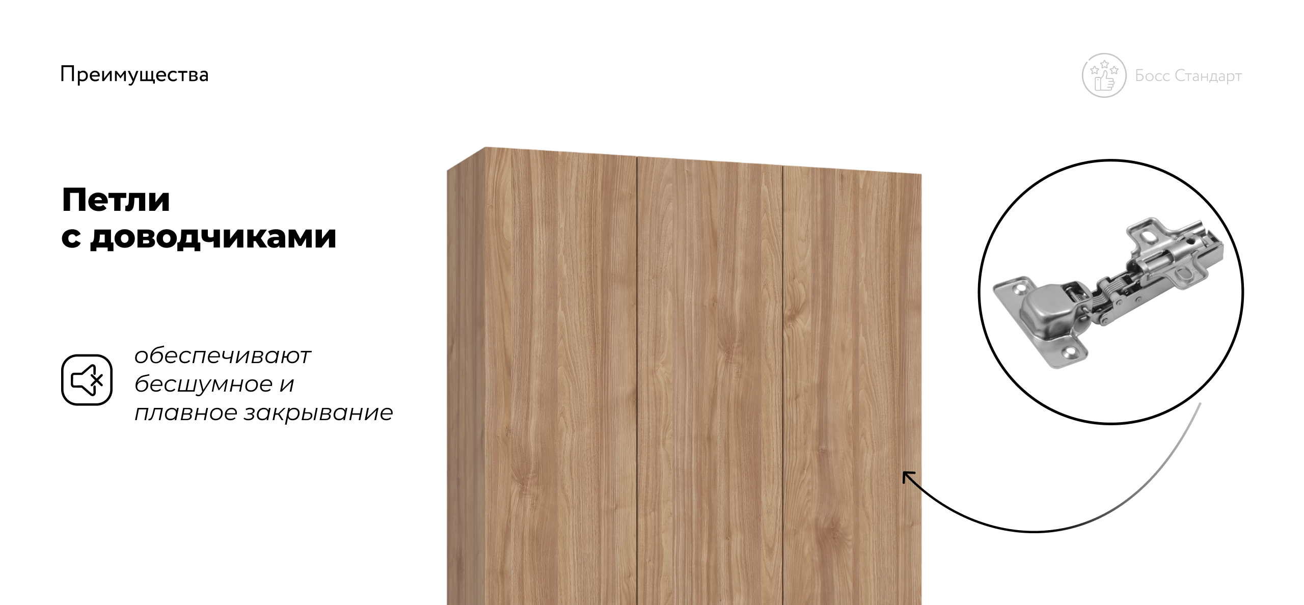 Двери с премиальными доводчиками открываются мягко и бесшумно, превращая утренний сбор в тихий ритуал. Корпус изготовлен из безопасной ЛДСП Е1 с износостойким покрытием, а аккуратно отделанная задняя стенка позволяет установить шкаф не только у стены, но и в свободной планировке. Босс Стандарт 120 создаёт ощущение простора и упорядоченности, превращая спальню или гостевую комнату в гармоничное, «дышащее» пространство.