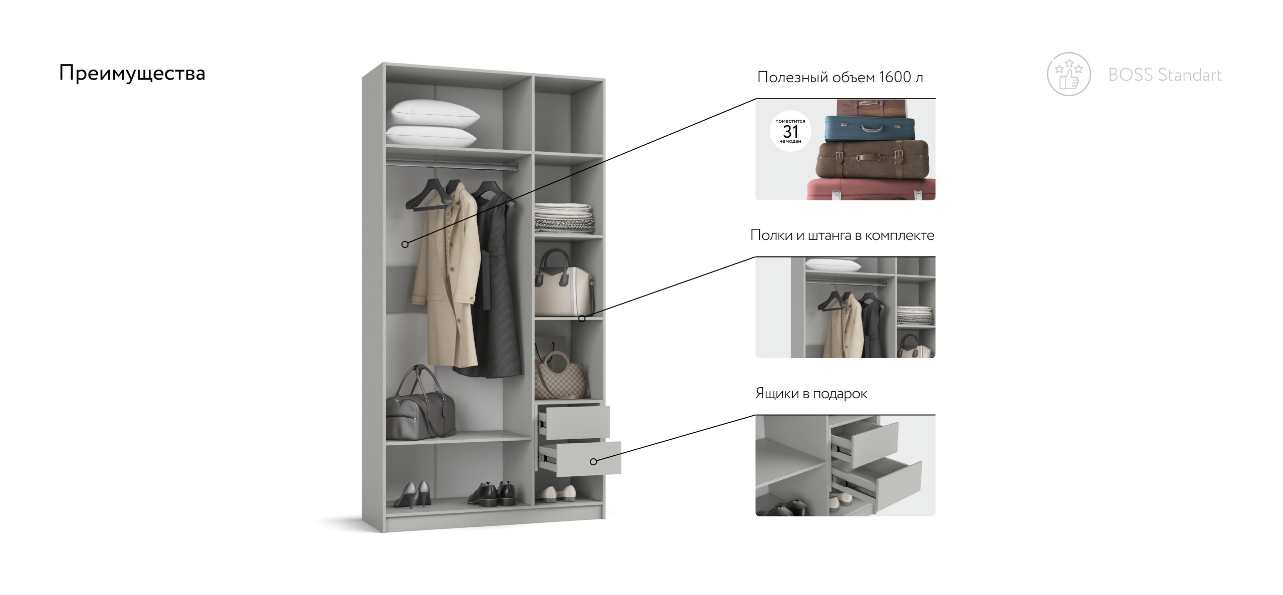 Коллекция корпусной мебели BOSS STANDART - новое направление сегодняшних трендов, создана для максимального комфорта и организации домашнего пространства.
