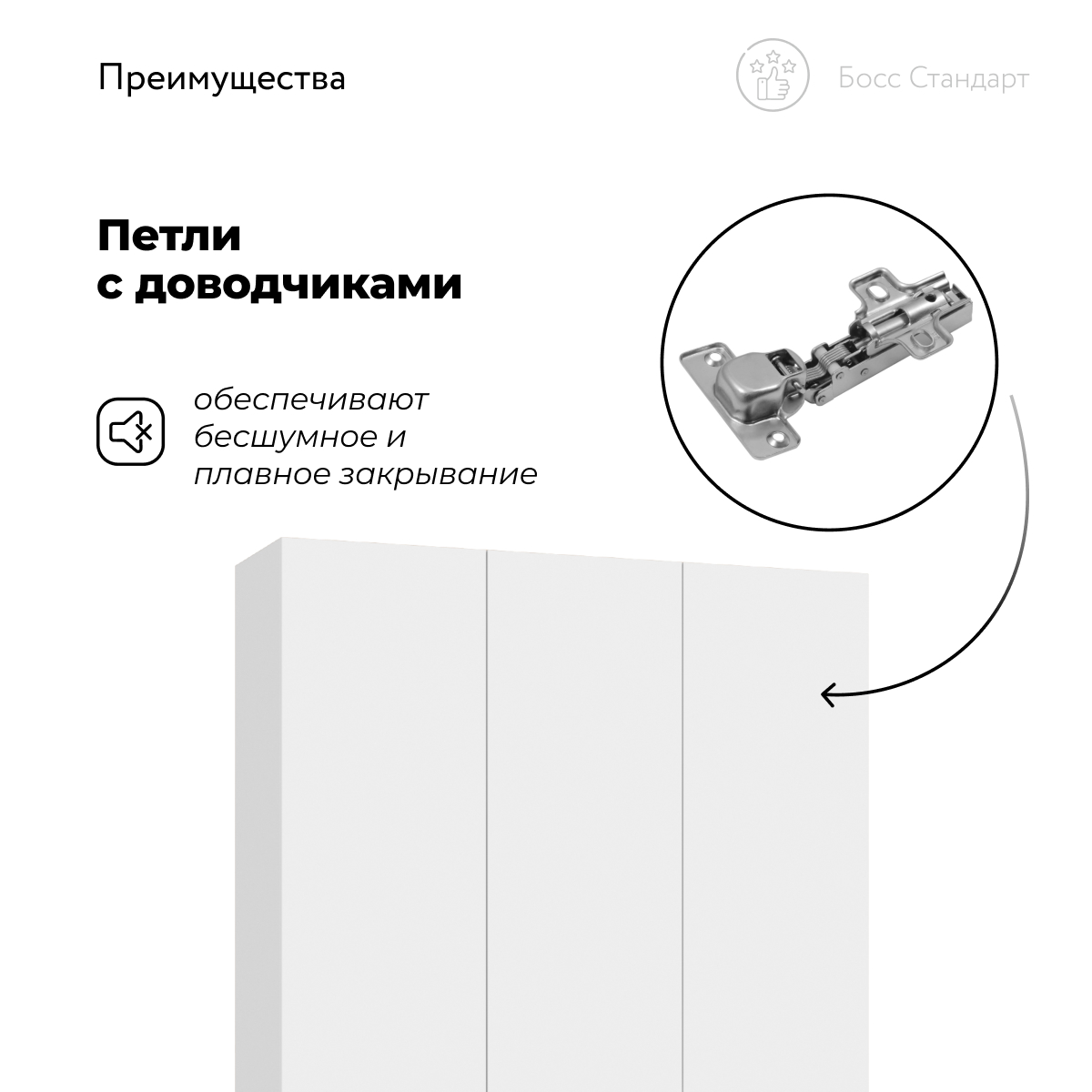 Гибкая компоновка превращает Босс Стандарт 135 в личный конструктор хранения. Полки и два выдвижных ящика можно установить справа или слева — по планировке и вашим привычкам. Двери с премиальными доводчиками открываются лёгким движением и закрываются плавно; ящики на шариковых направляющих выдвигаются бесшумно, не прерывая утренний ритм.