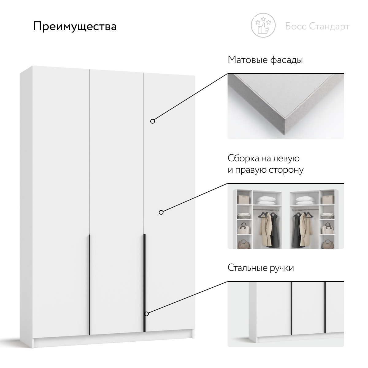 Корпус изготовлен из безопасной ЛДСП Е1 с устойчивым к истиранию покрытием, чтобы цвет и текстура радовали долгие годы. Босс Стандарт 135 создаёт ощущение простора и упорядоченности, превращая спальню или гостевую в гармоничное, «дышащее» пространство. Выберите шкаф, который аккуратно организует вещи и подчёркивает статус вашего интерьера.