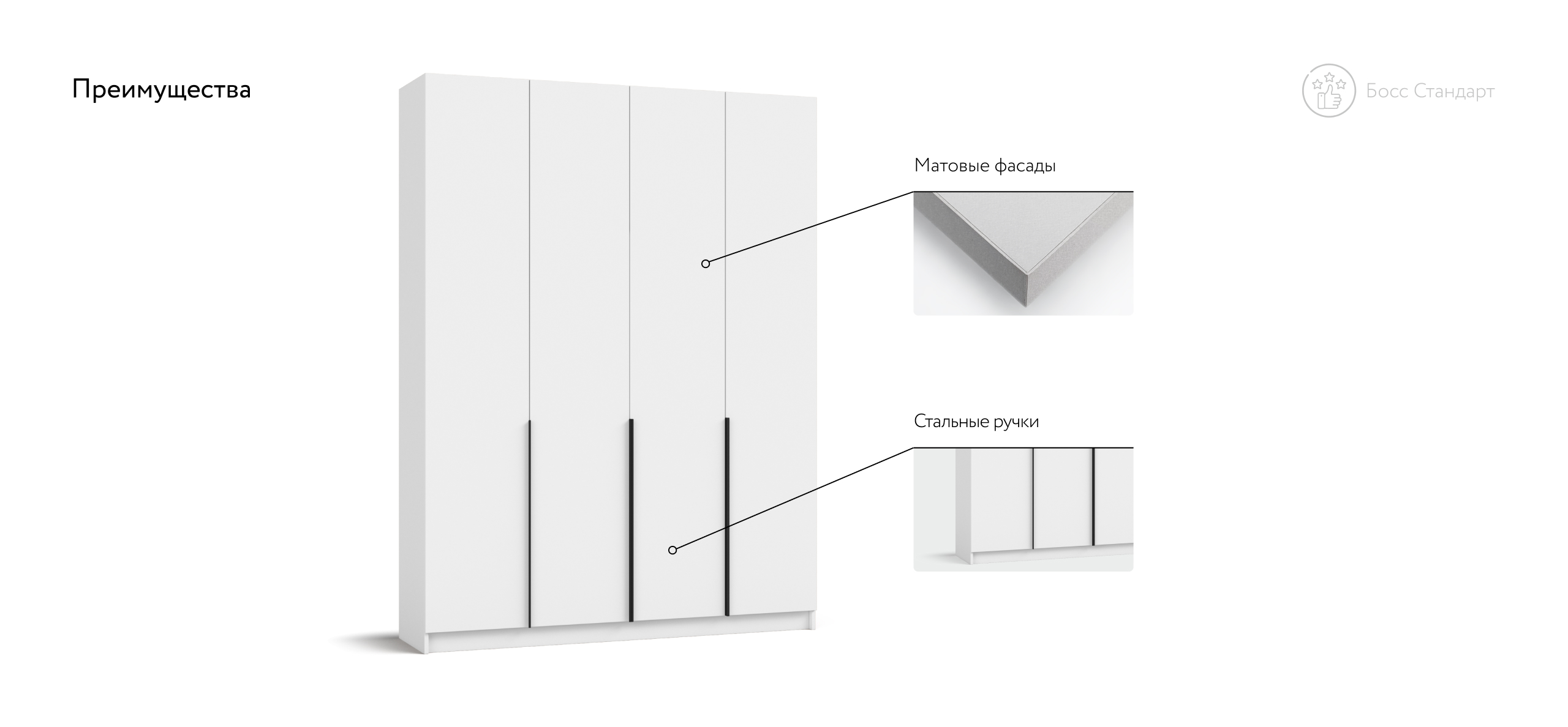 Корпус изготовлен из экологичной ЛДСП Е1 с износостойким покрытием, чтобы фактура и цвет радовали долгие годы. Босс Стандарт 160 дарит ощущение простора и упорядоченности, превращая спальню или гостевую комнату в гармоничное, «дышащее» пространство. Выберите шкаф, который не просто хранит вещи, а подчёркивает статус вашего интерьера.