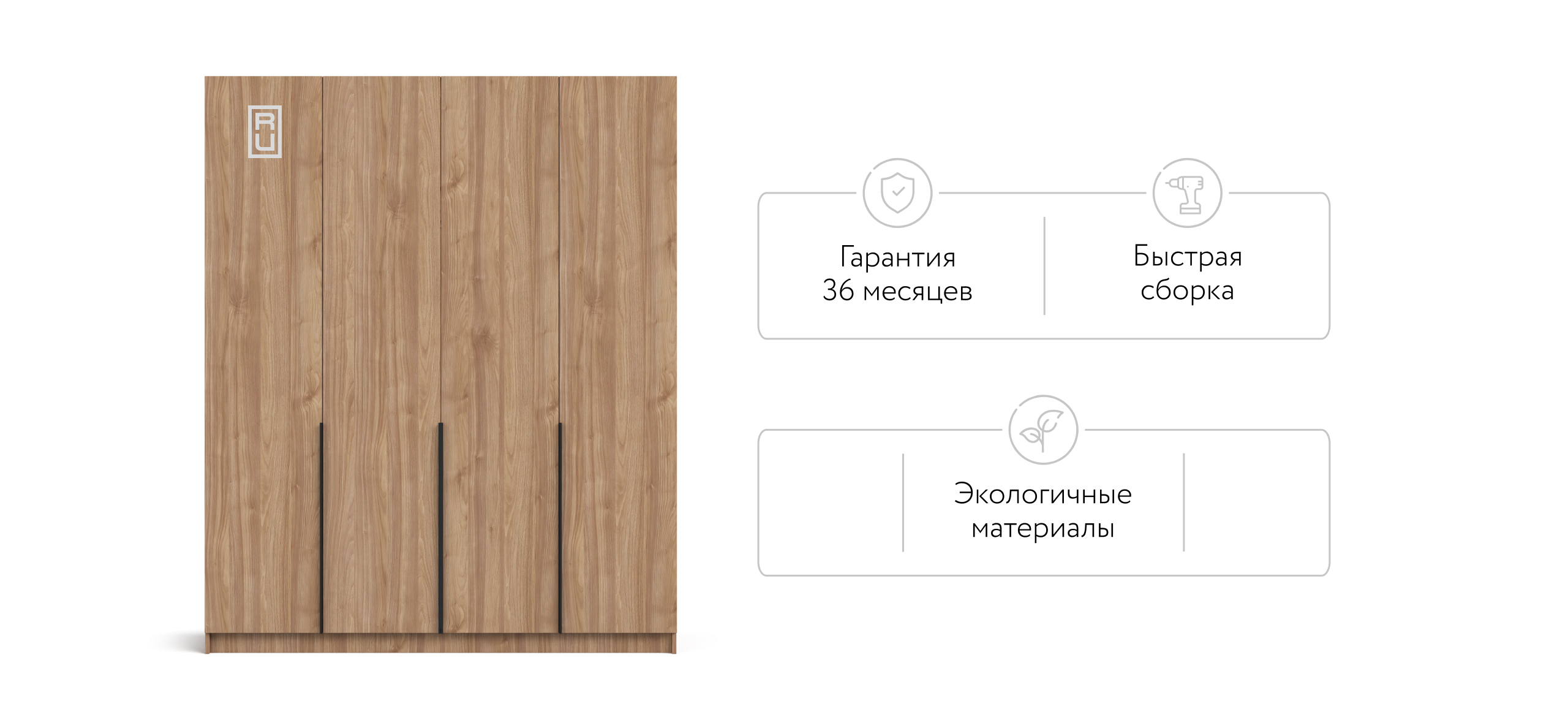 По бокам — две зеркальные секции с полками на всю высоту, в центре — штанга для длинной одежды. Полки выдерживают серьёзную нагрузку, а двери с премиальными доводчиками открываются плавно и бесшумно, ускоряя поиск вещей и избавляя от споров о «главной» стороне.