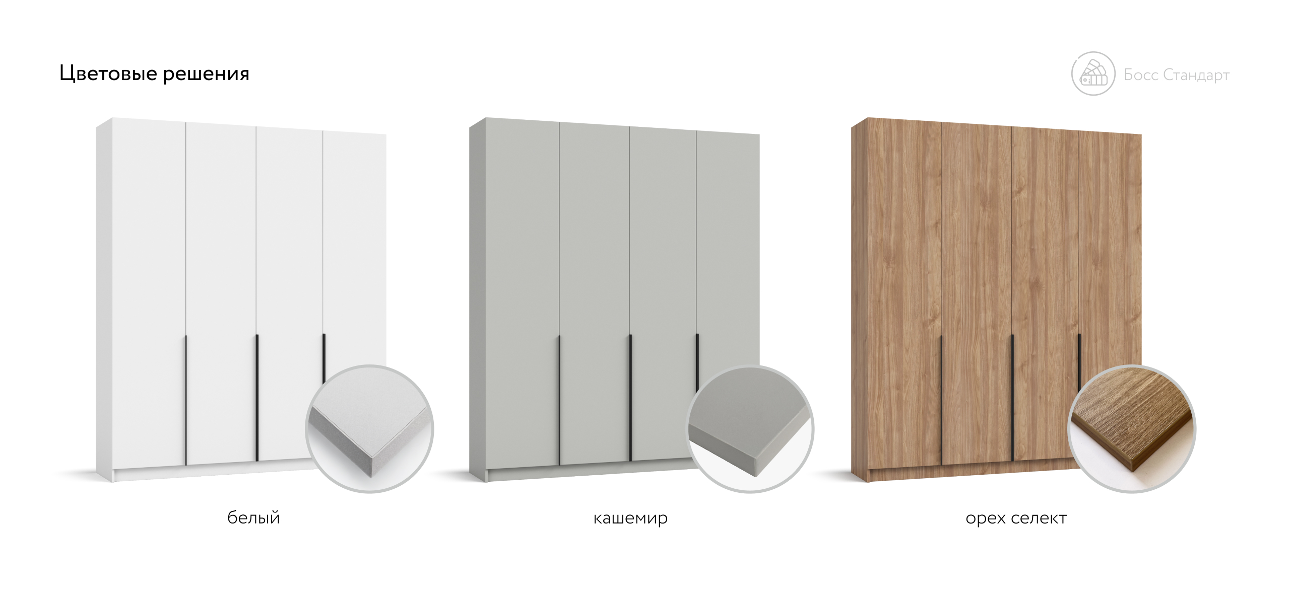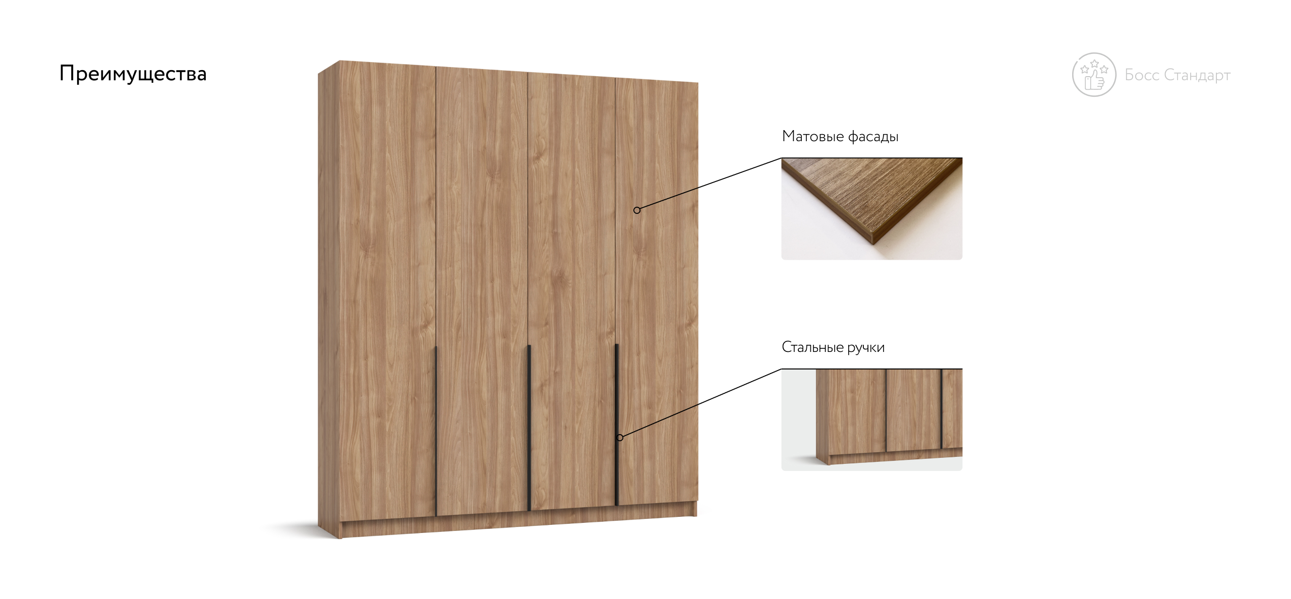 Корпус изготовлен из безопасной ЛДСП Е1 с износостойким покрытием, чтобы фактура и цвет радовали долгие годы. Босс Стандарт 180 дарит ощущение простора и упорядоченности, превращая спальню или гостевую комнату в гармоничное, «дышащее» пространство. Выберите шкаф, который не просто хранит вещи, а подчёркивает статус вашего интерьера.
