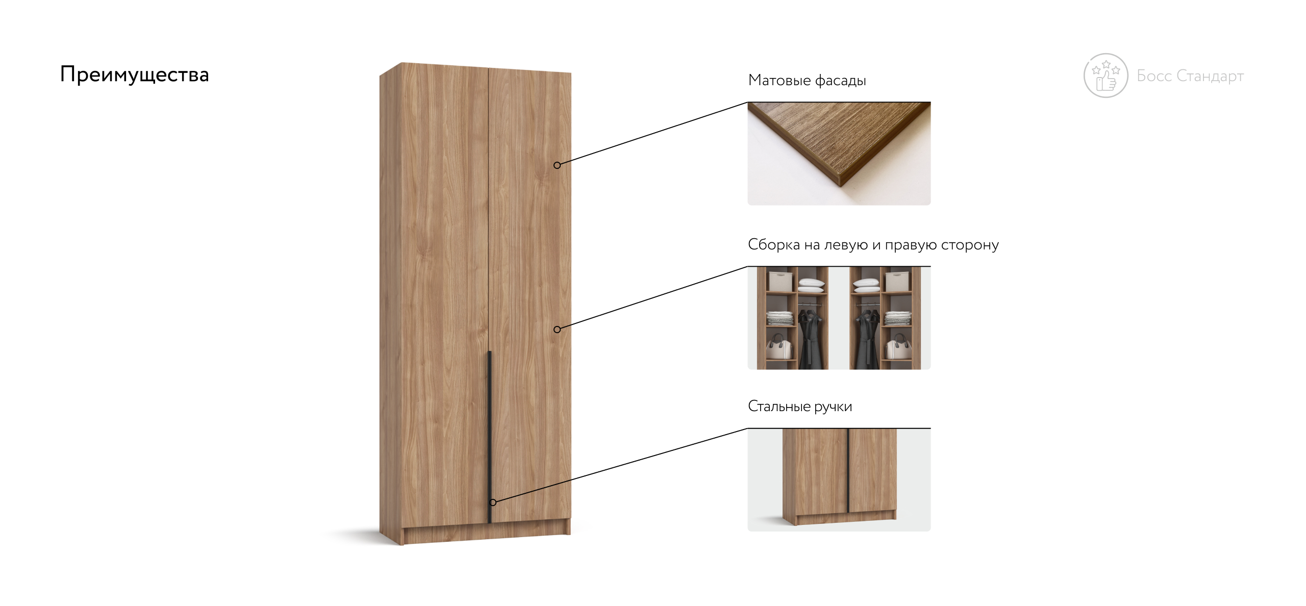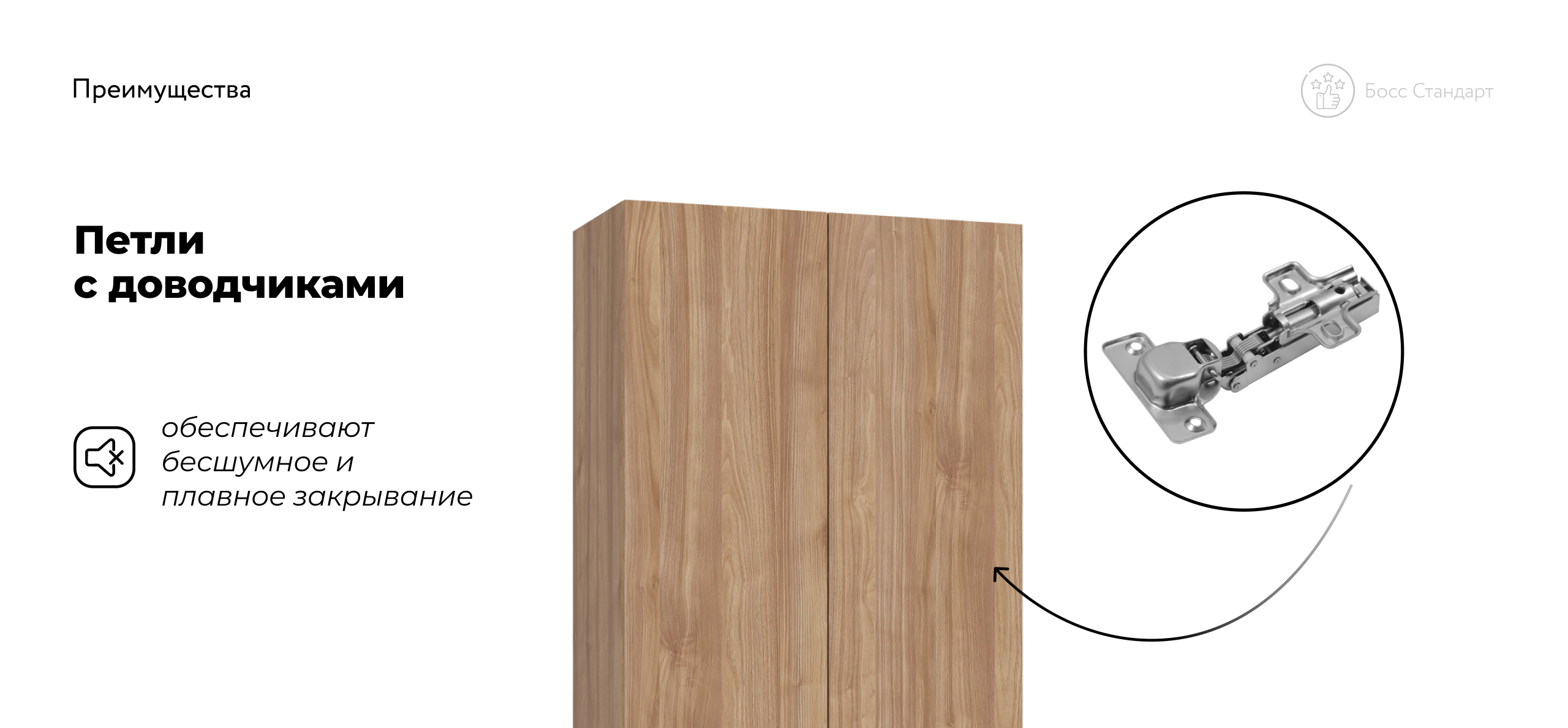 Гибкая компоновка превращает Босс Стандарт 80 в персональную систему хранения. Полки и два выдвижных ящика можно расположить справа или слева — выбирайте конфигурацию под планировку и ваши привычки. Двери с премиальными доводчиками открываются лёгким движением и закрываются мягко, поддерживая спокойный ритм утра.