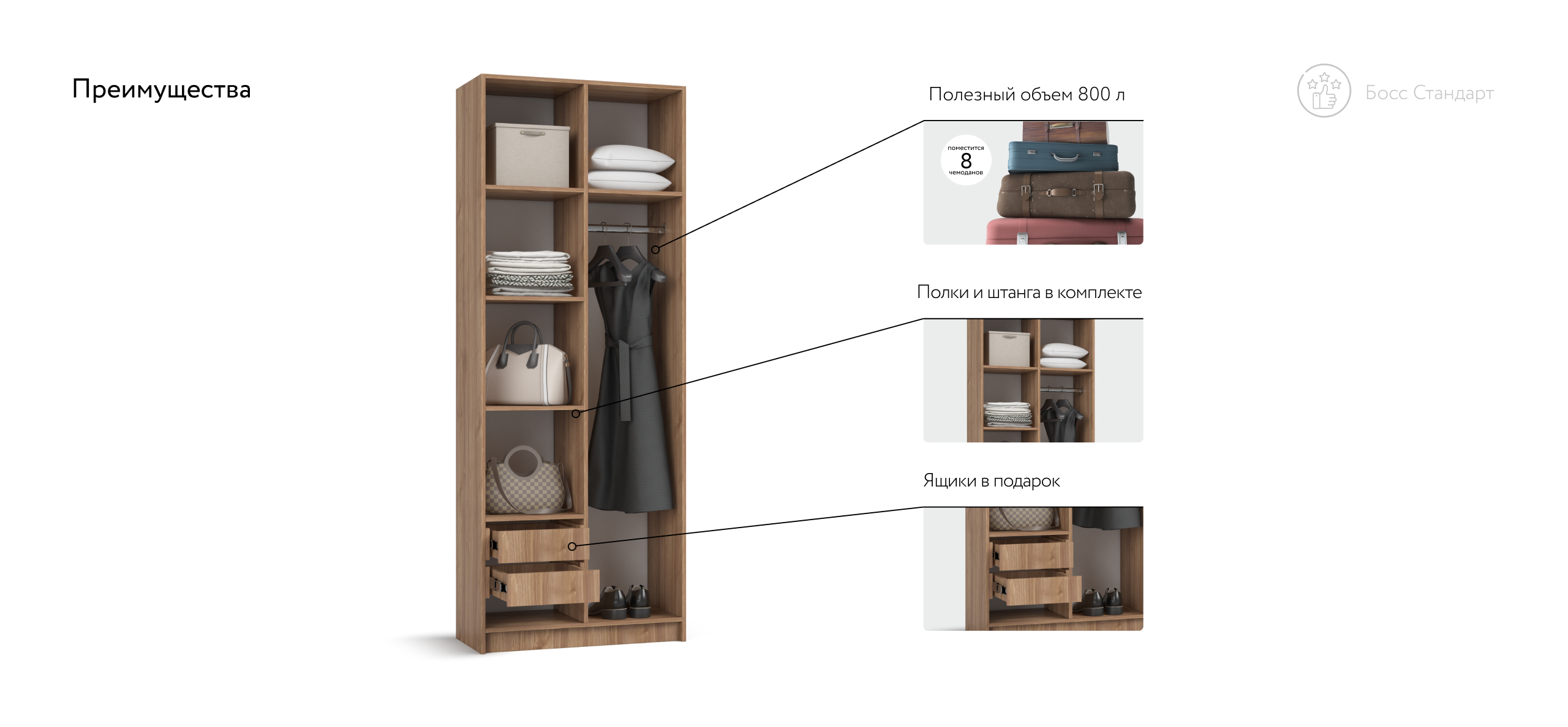 Босс Стандарт 80*220 шкаф распашной 2Д + ящики Орех Селект