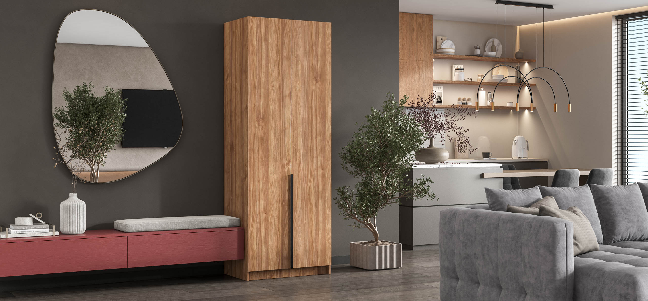 Шкаф Босс Стандарт 80 — компактное, но статусное решение для городской квартиры: хранить всё нужное, оставляя максимум свободного пространства. Лаконичный фасад с удлинёнными чёрными ручками отвечает эстетике 2025 года и становится ярким акцентом любого интерьера — от сканди до неоклассики. Каждый сантиметр внутри задействован: базовый гардероб, коробки с обувью и текстиль размещаются упорядоченно, освобождая комнату от визуального шума.