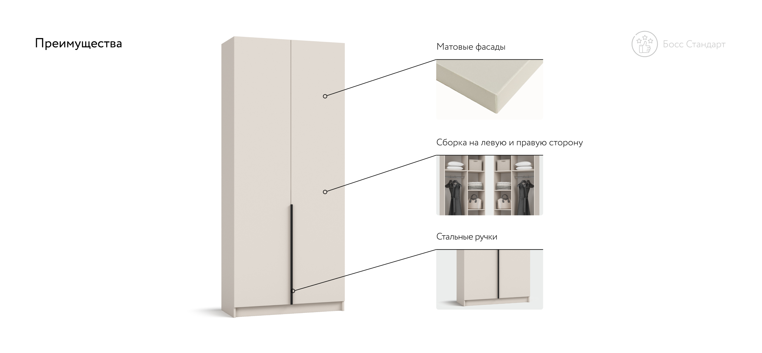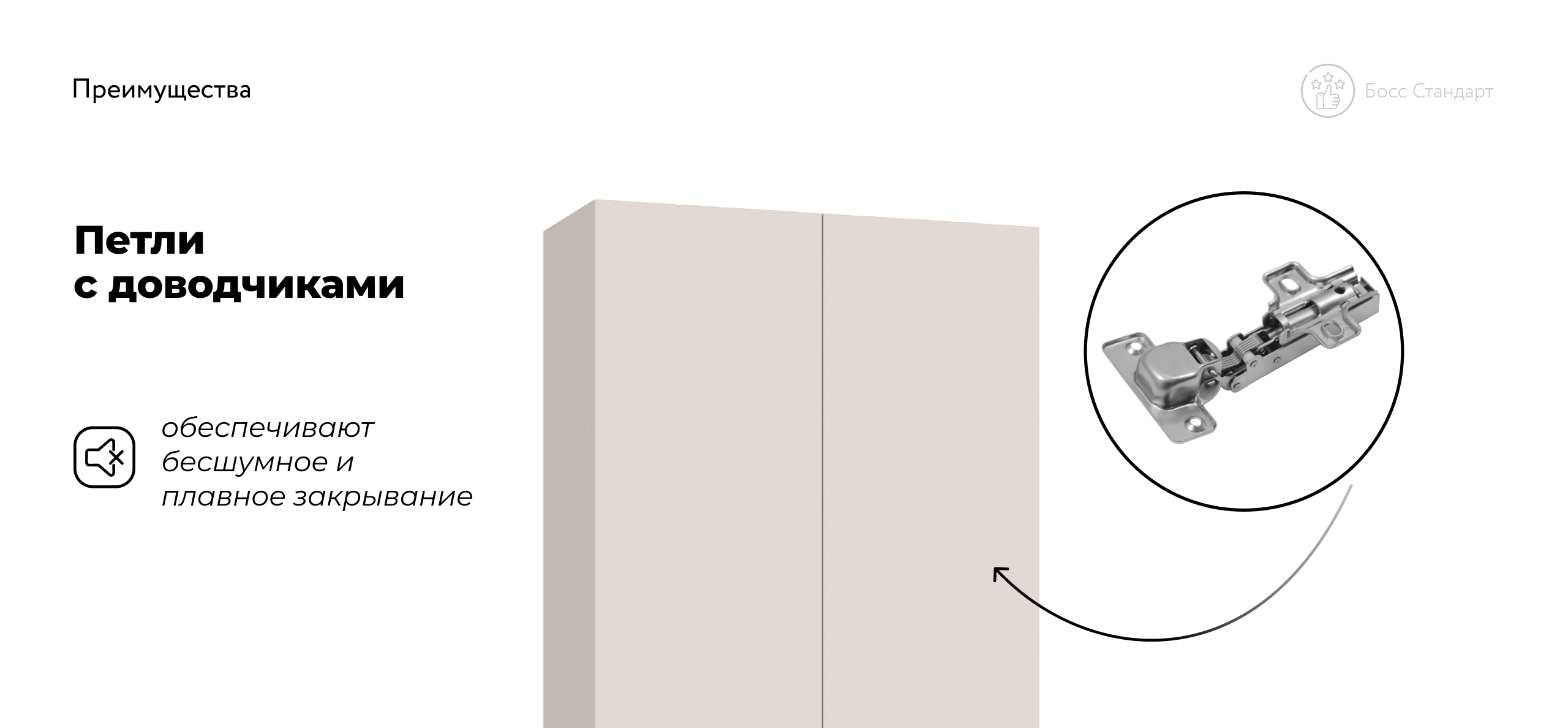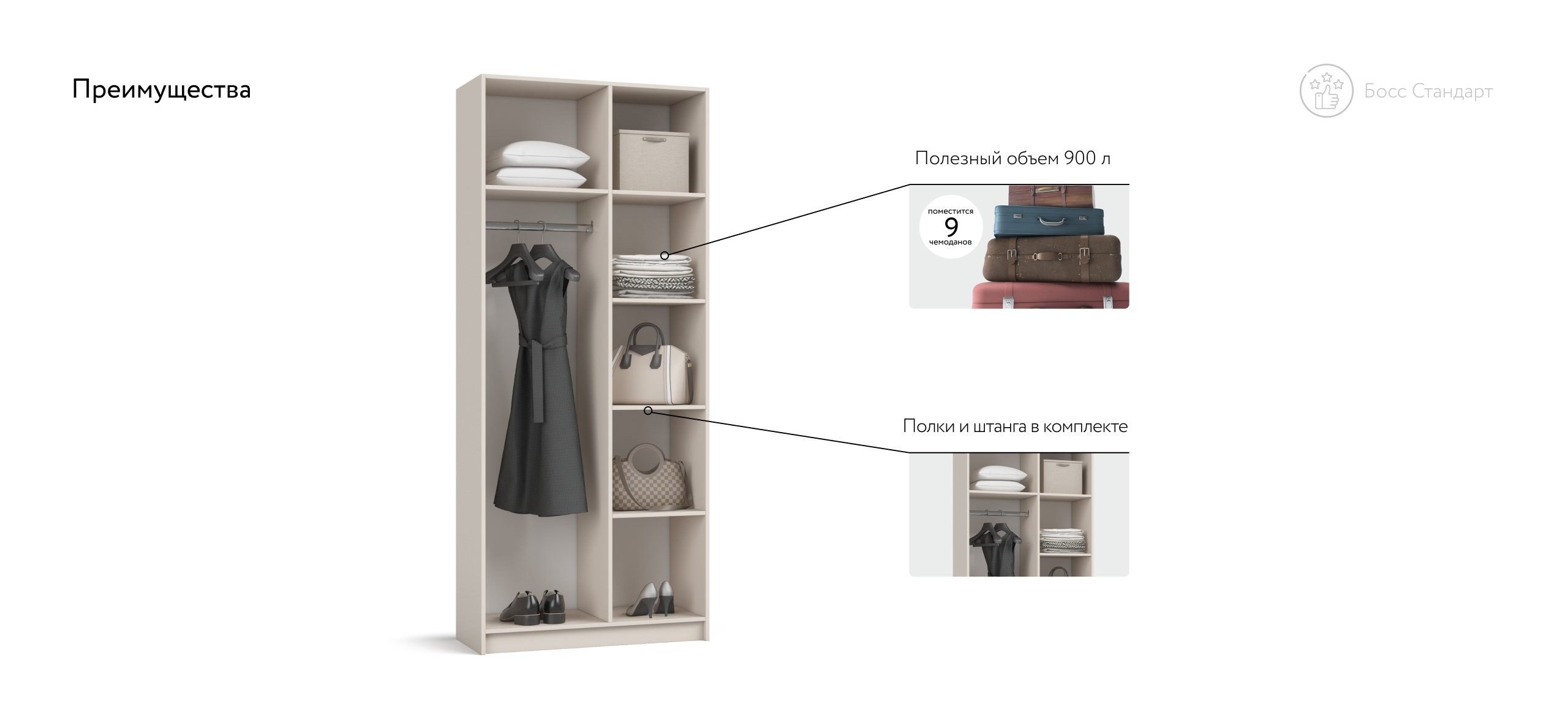 Гибкая компоновка превращает Босс Стандарт 90 в персональную систему хранения. Переставляемые полки можно расположить на нужной высоте — под планировку комнаты и ваши привычки. Двери с премиальными доводчиками открываются лёгким движением и закрываются мягко, не нарушая утренний ритм.