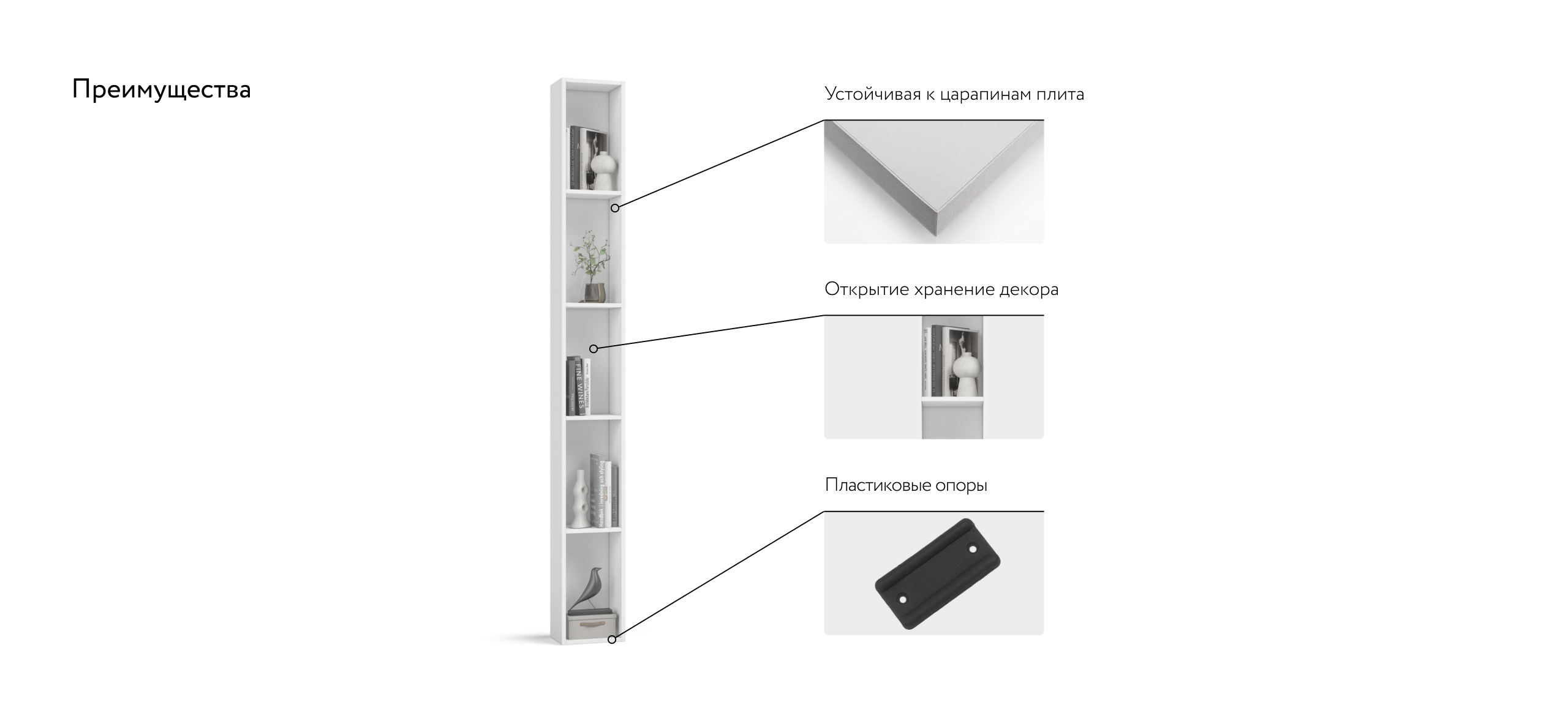 Стеллаж 220 — естественное продолжение серии шкафов: они идеально совпадают по глубине и крепятся к корпусу, образуя единую, выверенную линию мебели.