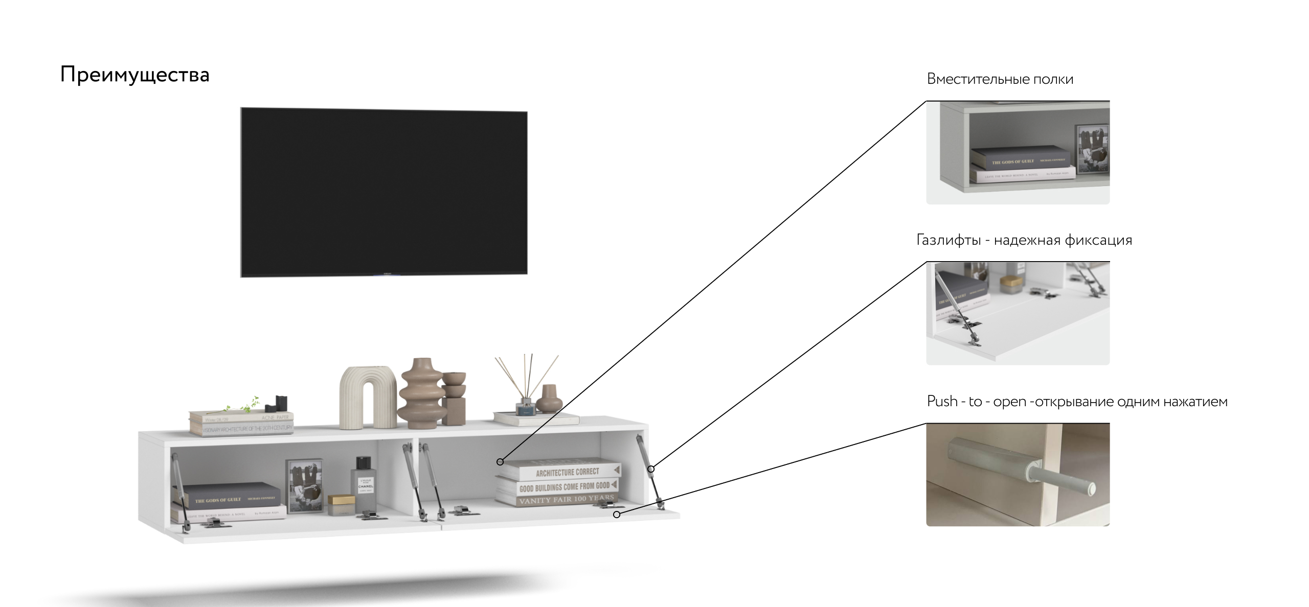 Вместительная ТВ тумба BOSS STANDART 140 с полностью закрытым хранением идеально подходит для хранения личных вещей, ТВ аксессуаров. Тумба оснащена фасадом с подъёмным механизмом, который плавно и бесшумно откидывается вниз, образуя доступ ко всему внутреннему пространству. ТВ Тумба оснащена системой Push-to –open, которая обеспечит легкое открывание дверцы одним нажатием.