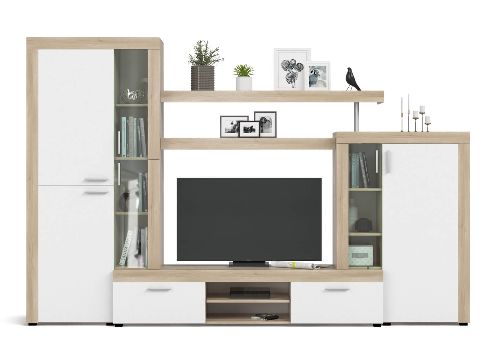 Стенка Монтана – стильная стенка, которая отличается лаконичностью форм и элегантным сочетанием светлых фасадов и корпуса в древесном декоре.