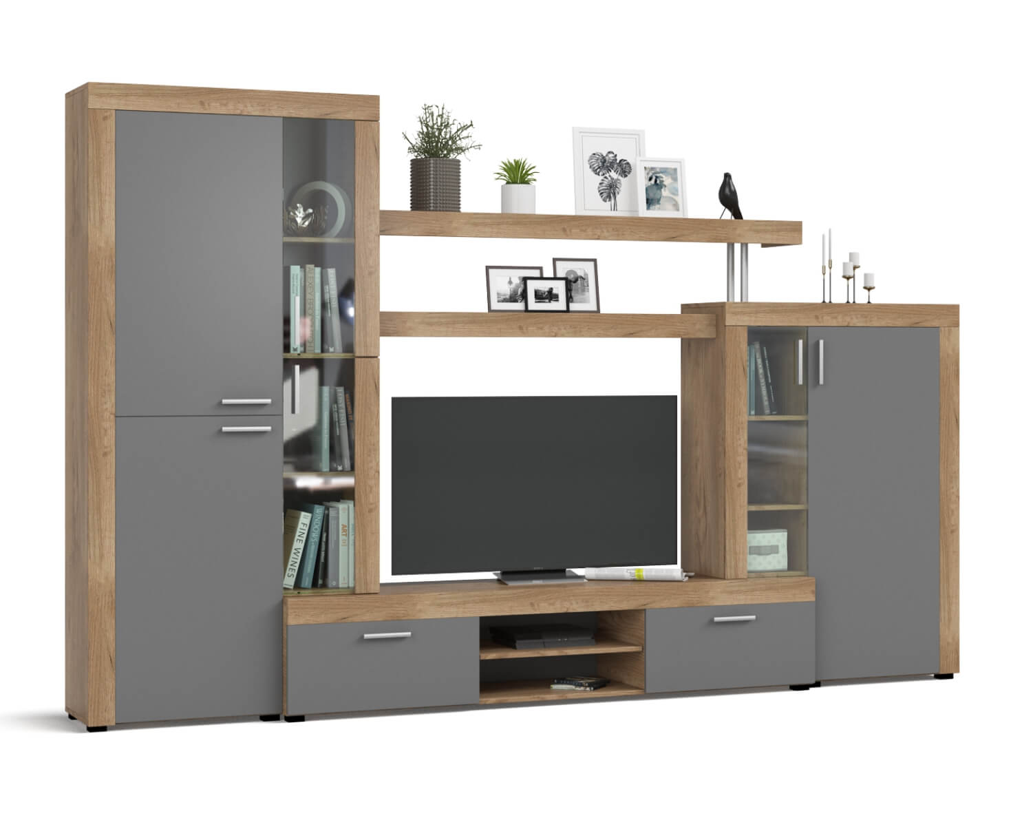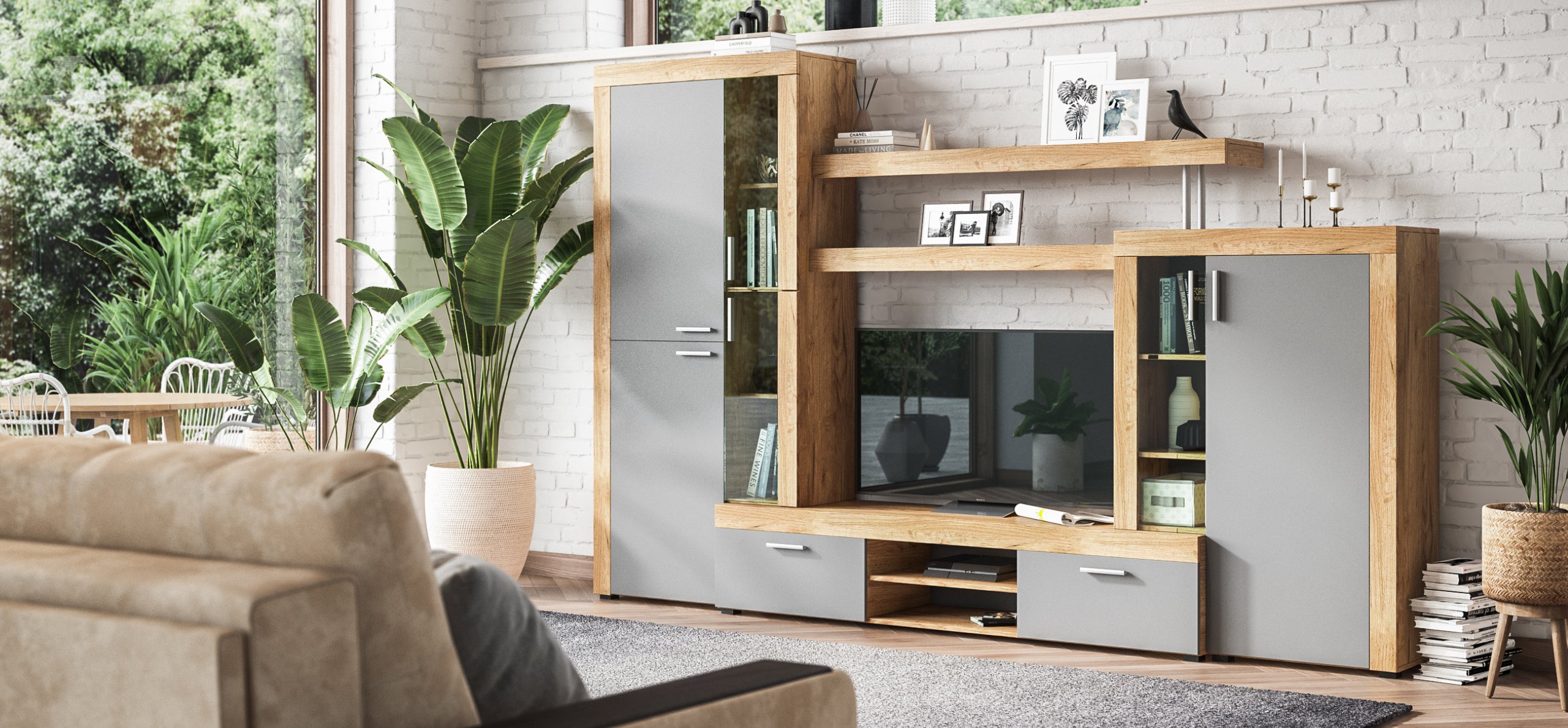 Стенка Монтана – стильная стенка, которая отличается лаконичностью форм и элегантным сочетанием светлых фасадов и корпуса в древесном декоре.